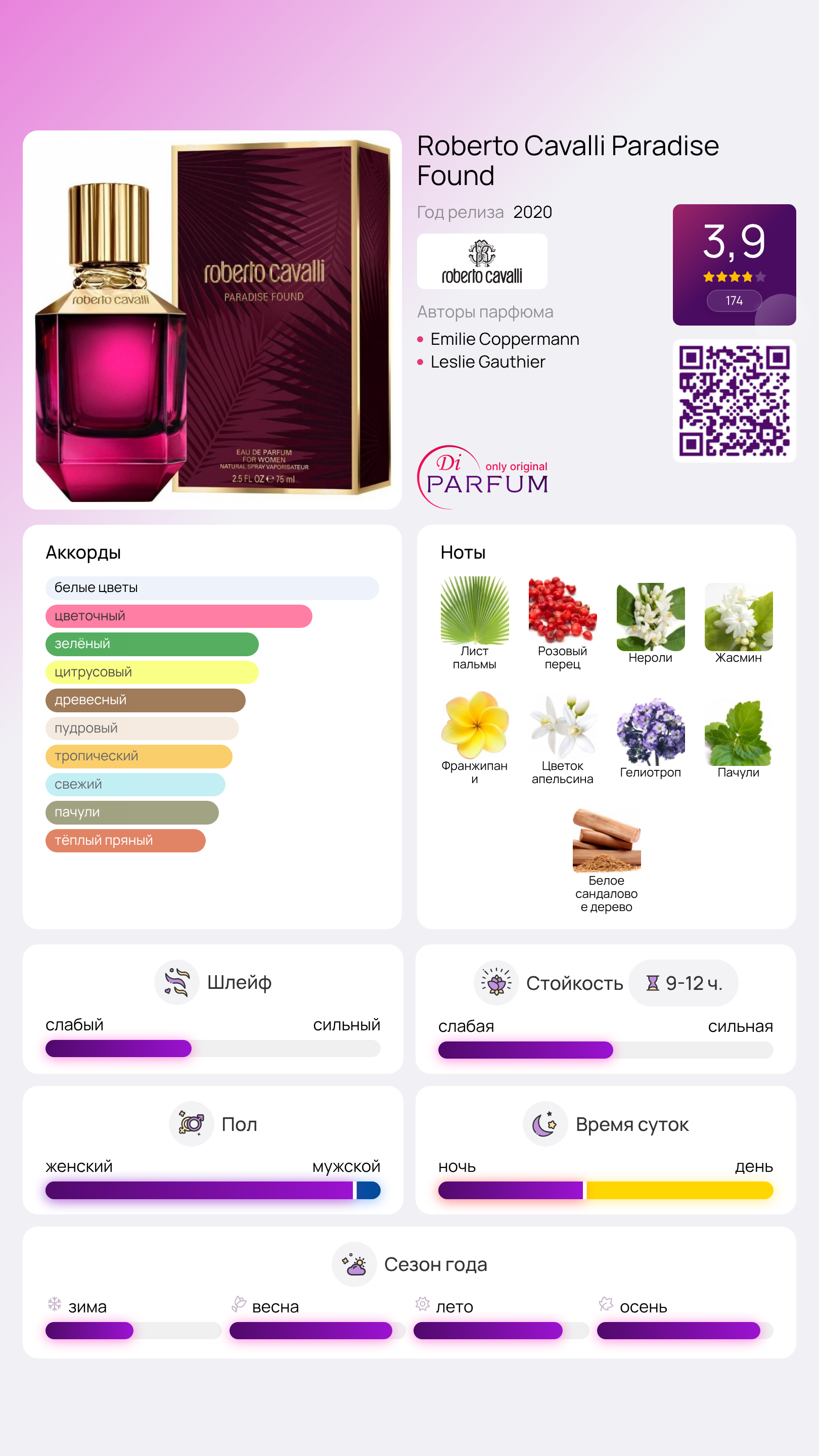 В теплом воздухе разносится насыщенный, притягательный аромат жасмина, проникнутый солнечным теплом апельсинового нектара и сладко-пряной магией франжипани с фруктовыми нотами. Нежные миндальные ноты гелиотропа создают базу аромата Roberto Cavalli Paradise Found, обогащенную молочным бархатом сандала и маслянистым послевкусием черного шоколада, полученного от зажатых в руках листьев пачули.