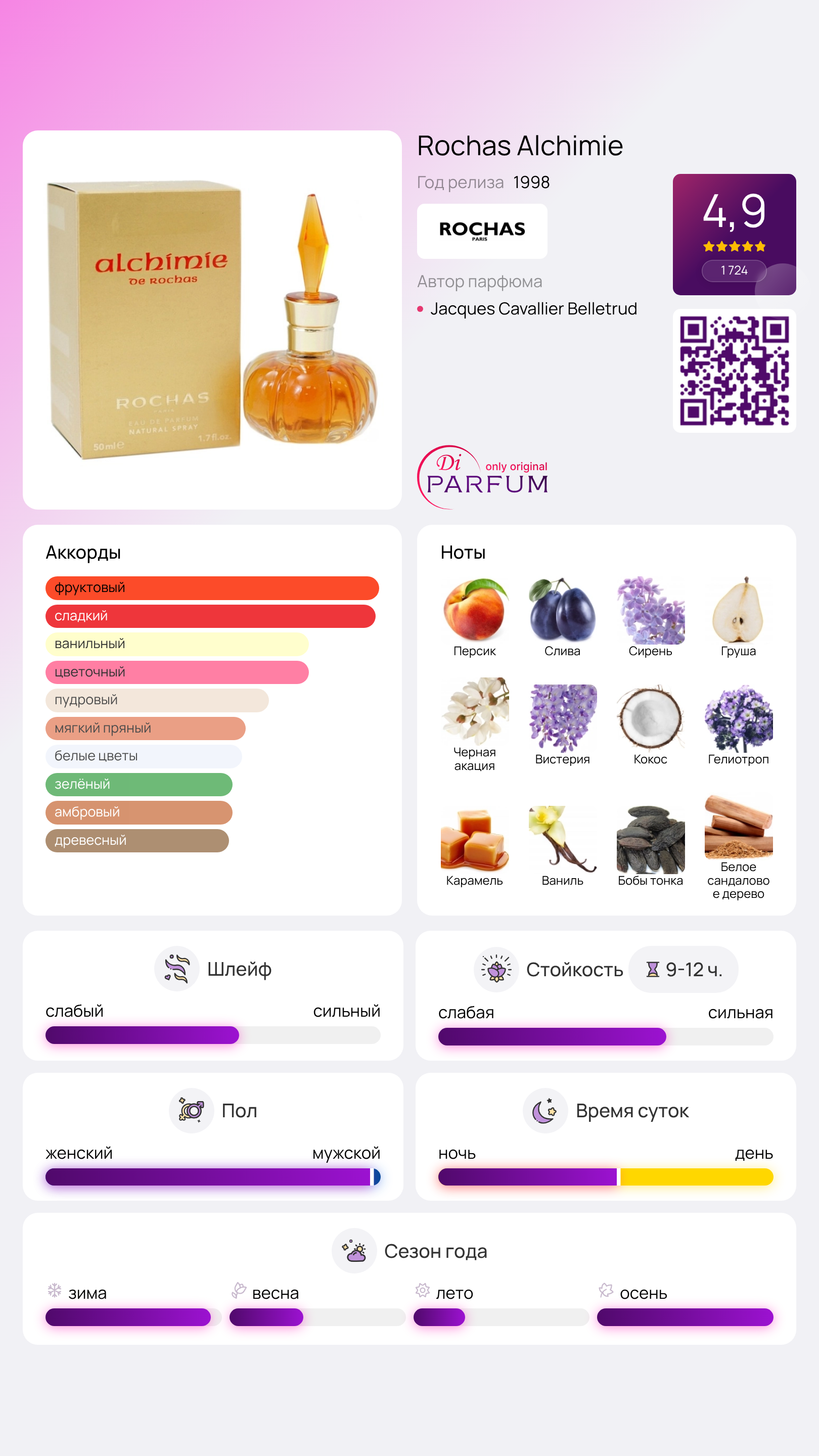 В Alchimie ощущается утонченная игра ароматов, которая превращает каждый момент в волшебный. Этот парфюм — идеальный выбор для уверенной в себе женщины, стремящейся подчеркнуть свою индивидуальность и обаяние. Alchimie станет отличным дополнением как для повседневной жизни, так и для особых случаев.