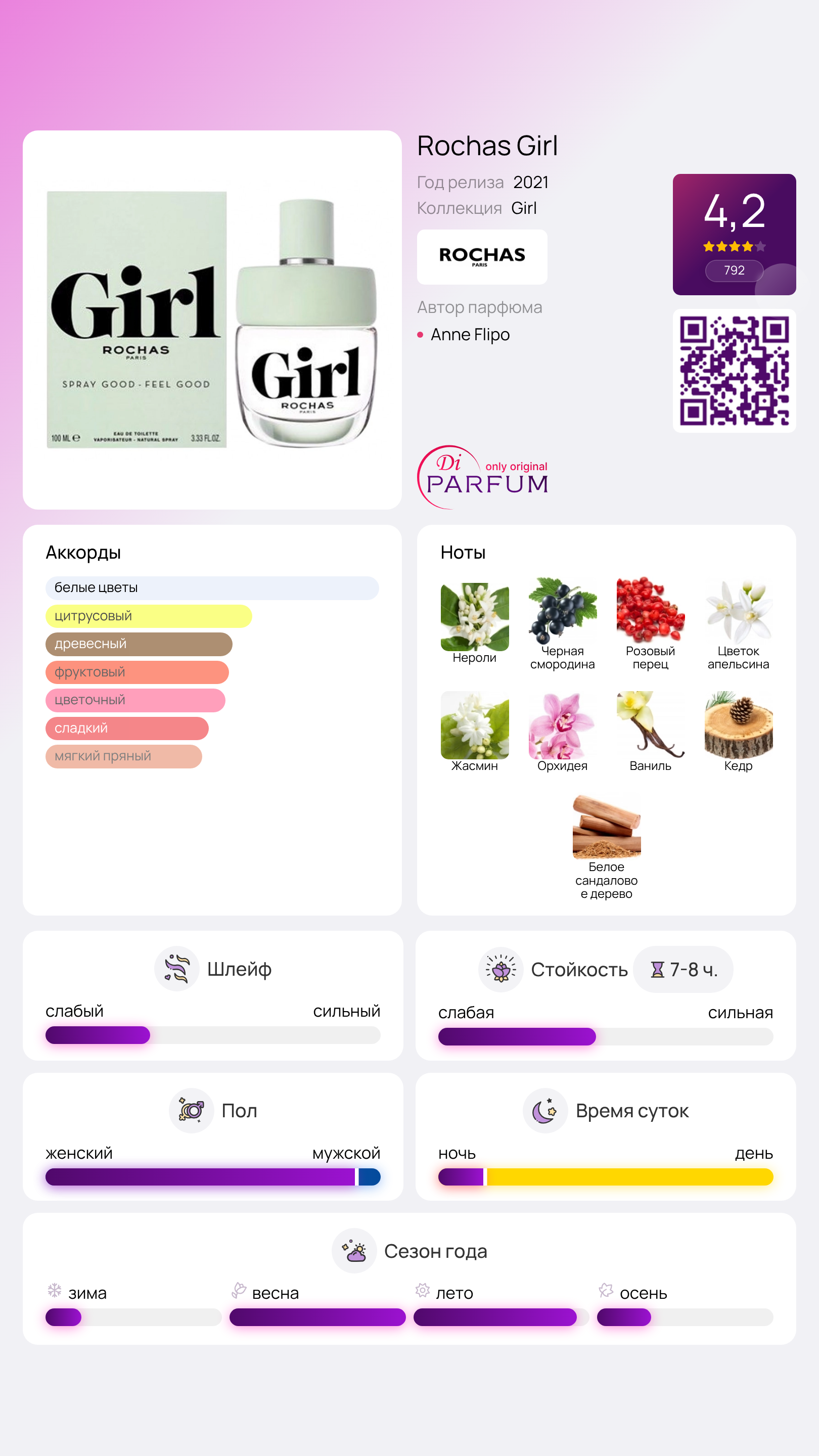 Rochas Girl - это современная цветочная мускусно-восточная композиция, вдохновляющая на самовыражение и гармонию с личным миром. Этот аромат стал символом нового поколения женщин, осознанно относящихся к себе и не боящихся отвергать социальные нормы и стереотипы. Rochas Girl представляет собой манифест свободного мышления для тех, кто стремится к изменениям.