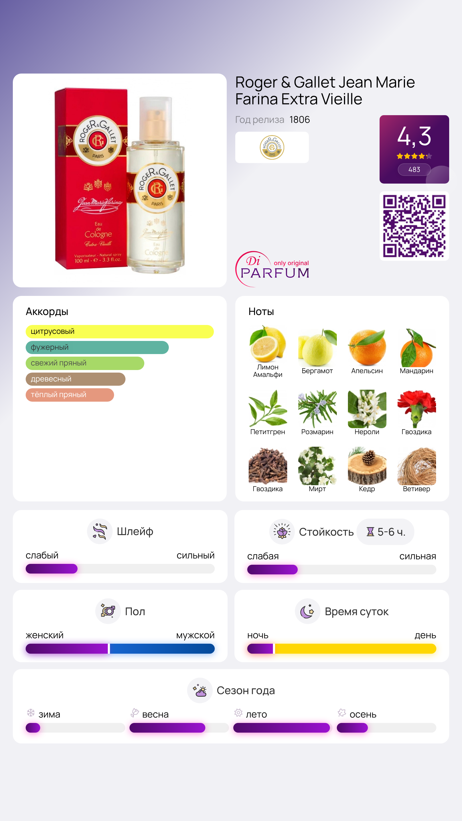 Цитрусовая "верхушка" представляет собой искрящийся и захватывающий коктейль, состоящий из бергамота, лимона, мандарина и апельсина. "Сердцевина" аромата наполнена нотами нероли, мирта, петигрена, гвоздики, розы и розмарина, а "послевкусие" завершается выразительным пряно-гвоздичным аккордом.