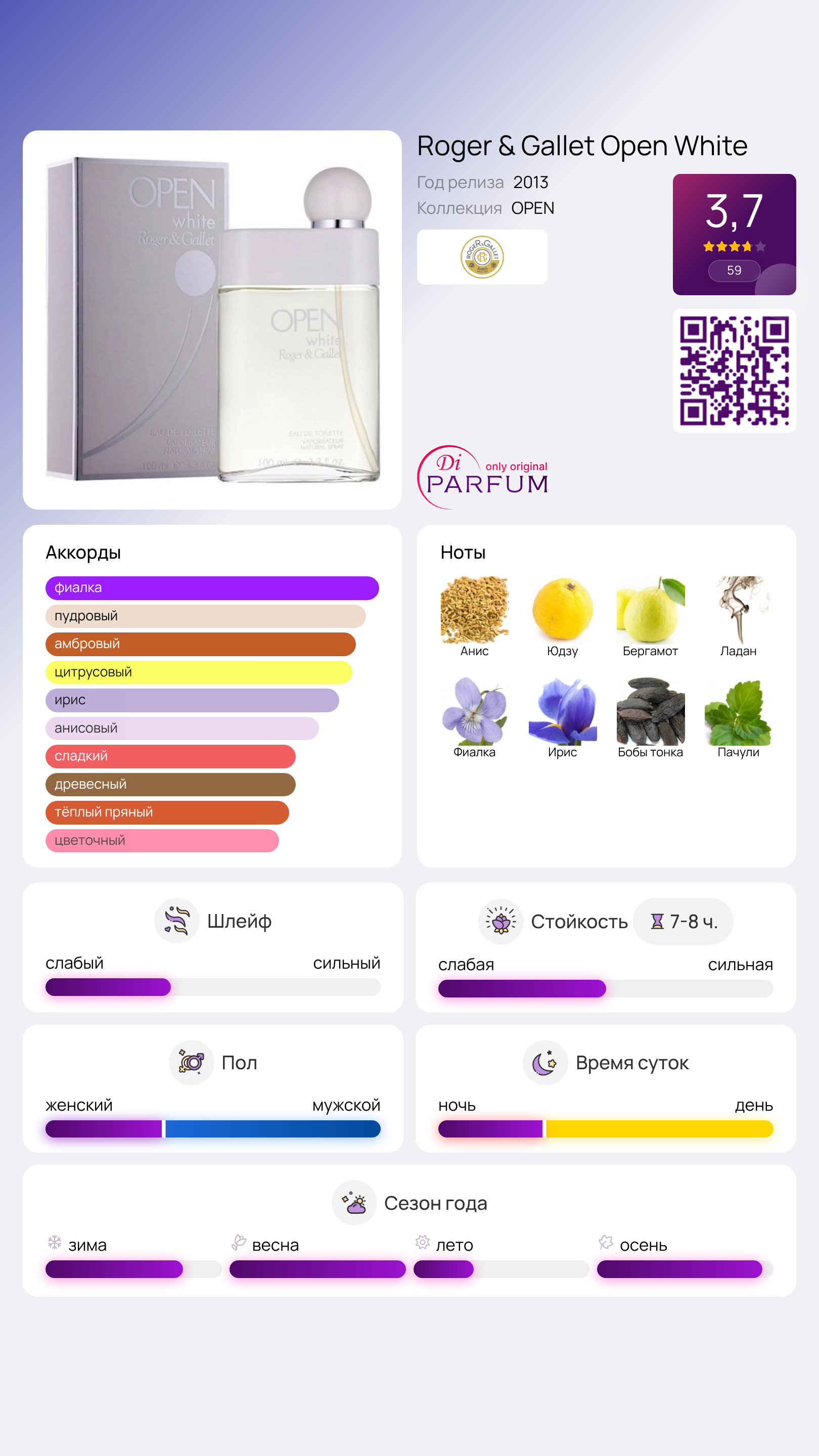 Open White от Roger & Gallet – это изысканный флористический аромат для мужчин, который был представлен на рынке в 2013 году. Этот парфюм идеально подходит для уверенных в себе индивидуумов, которые ценят уникальность и стиль.