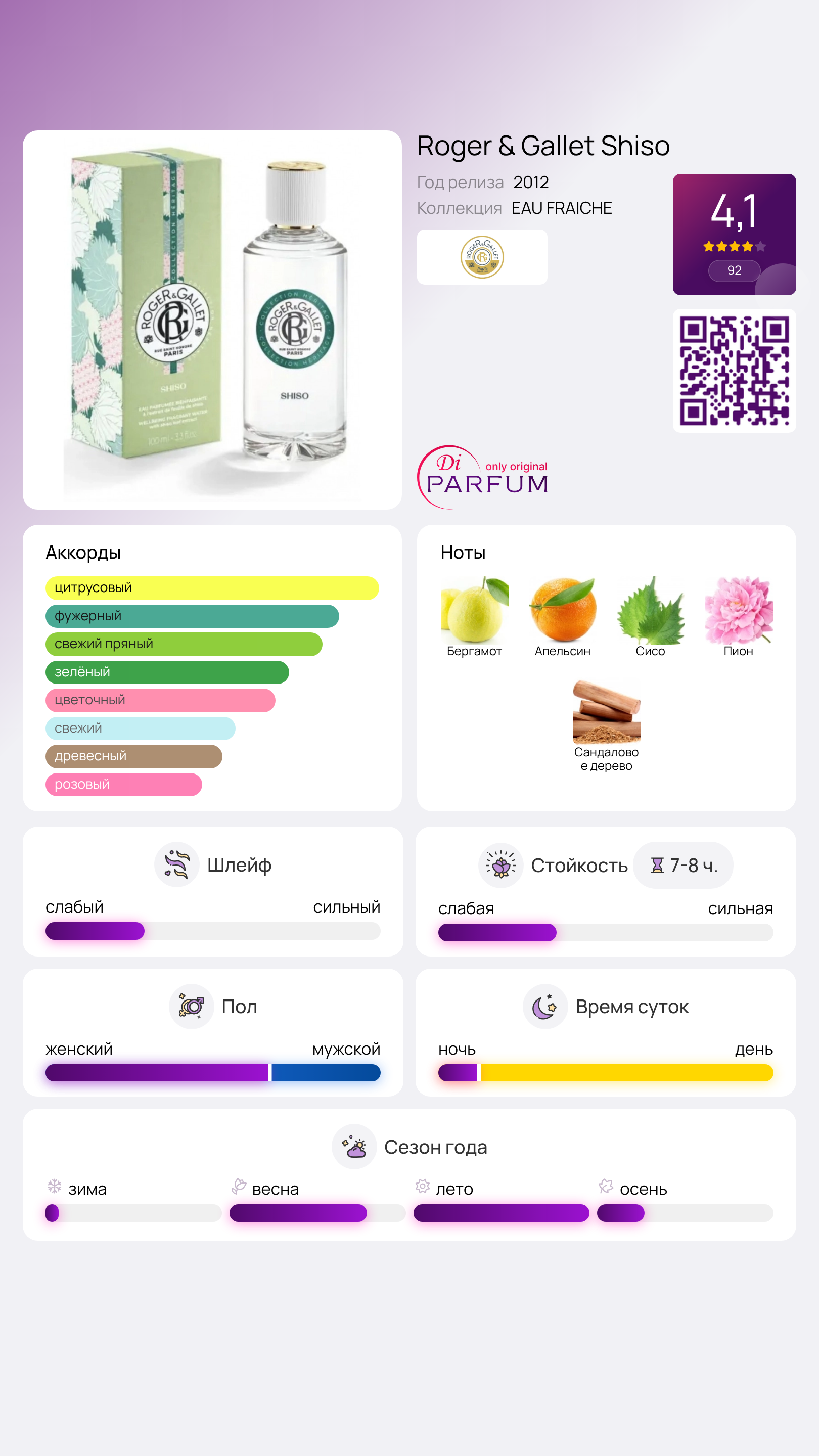 Roger & Gallet Shiso – это изысканный пряный парфюм, который объединяет в себе восточные нотки и свежие акценты природы, создавая утонченную и многослойную композицию, подходящую как для сильной, так и для слабой половины человечества.