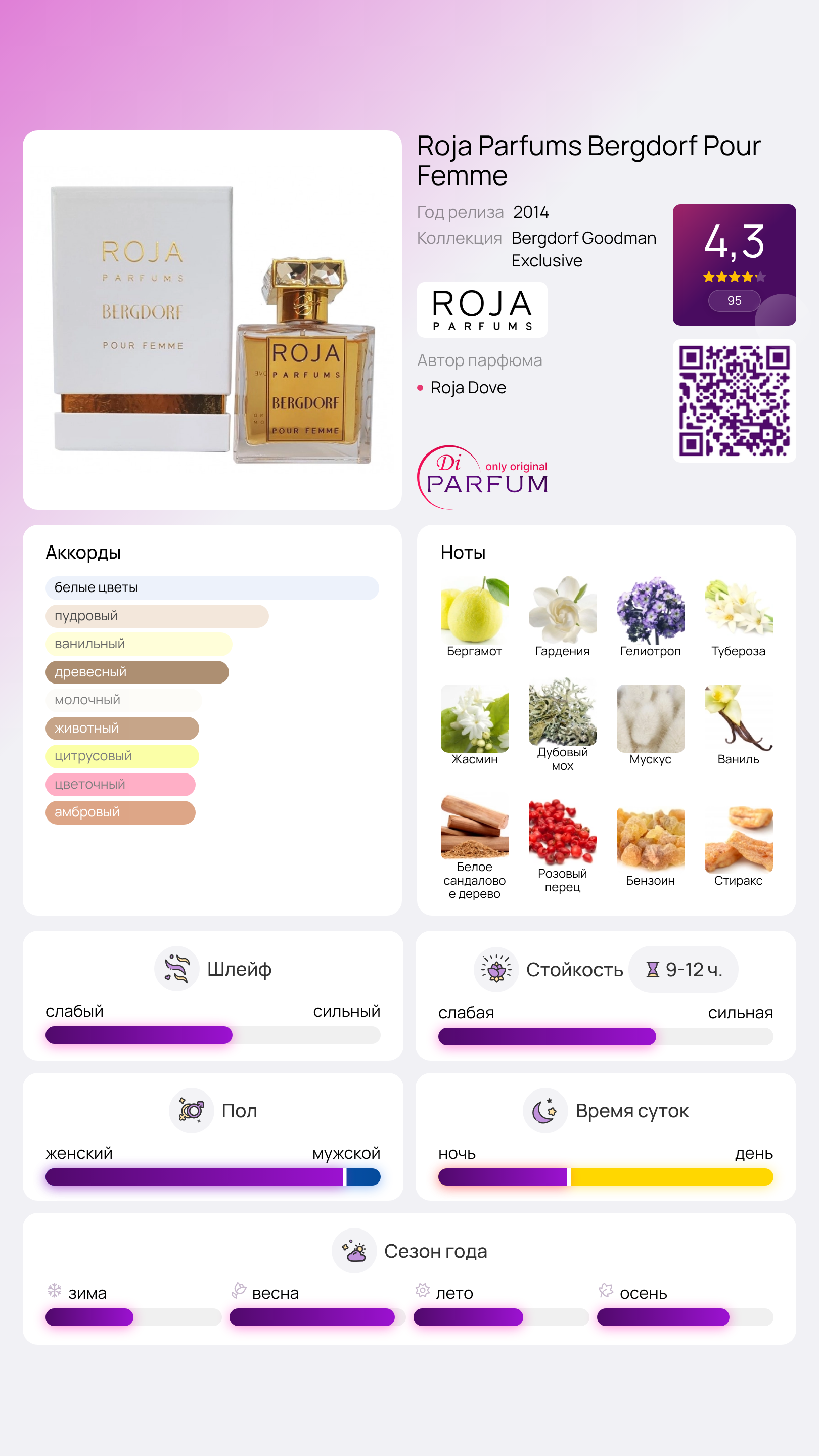 Шлейф аромата окутывает сладковатой ванилью, смолистым бензоином и влажным дубовым мхом. Он вызывает ассоциации с ярким и искренним шипром, а также воображением увлекательного шопинга в культовых магазинах мечты. Изысканный аромат Bergdorf Pour Femme от Roja Parfums воплощает поразительную красоту и утонченность Женственности. Эти духи представляют собой женскую часть ароматического дуэта, который был предложен брендом из Великобритании в 2014 году.