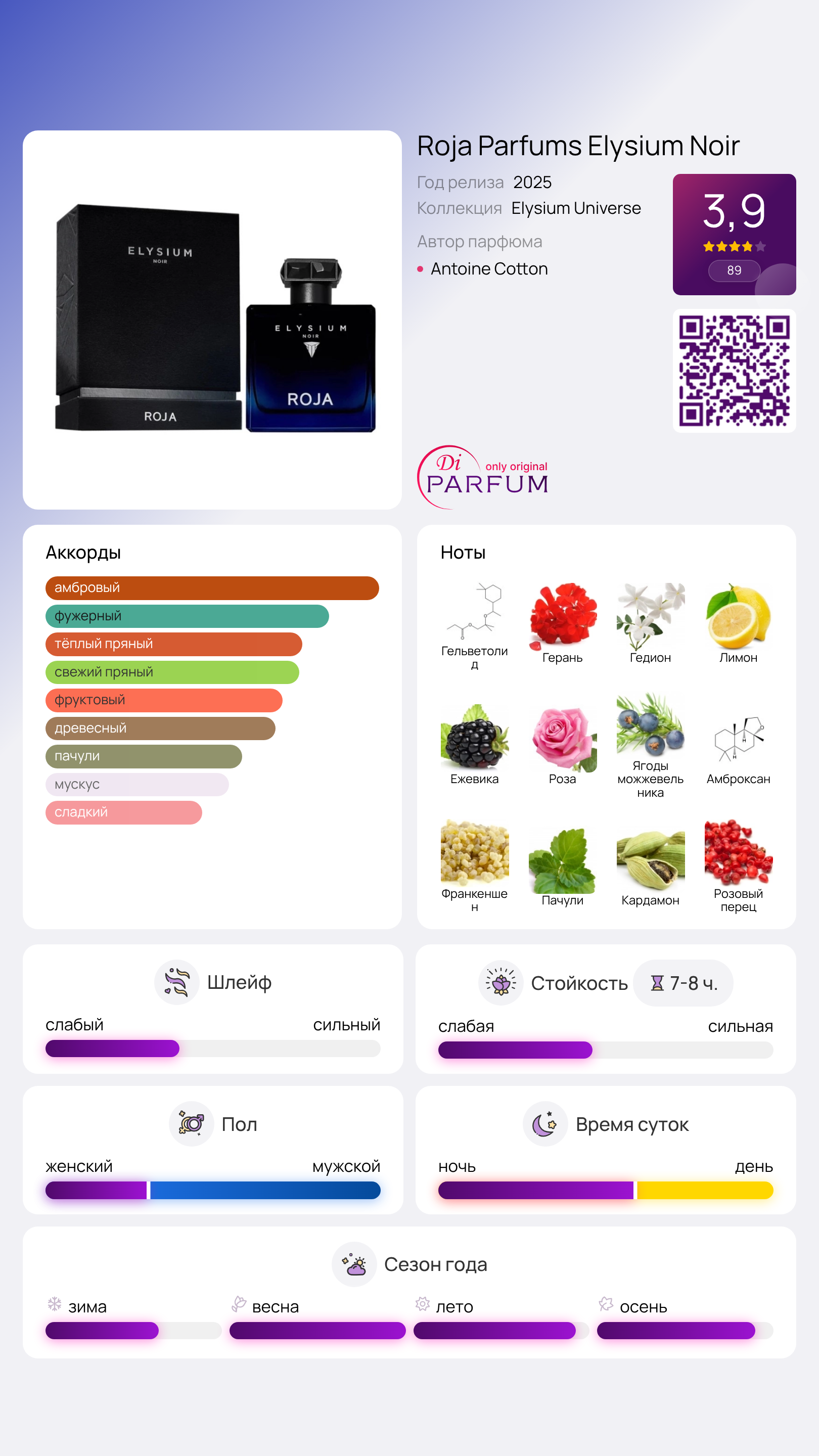 Этому аромату суждено занять достойное место в легенде ROJA Elysium. Elysium Noir — третья глава в этой серии, представляющая собой ольфакторное выражение рая после заката. Это смелая эволюция оригинального аромата, которая предлагает более глубокую и соблазнительную ауру. Elysium Noir создан для мужчины, который легко перемещается из дня в ночь, сохраняя при этом контроль над ситуацией. Сочетание мягкой кожи и притягательной свежести ежевики обеспечивает баланс между утонченностью и неистовой силой, сохраняя свежесть своего предшественника. Этот аромат символизирует новую эру современной высокой парфюмерии, предназначенной для мужчин, которые управляют своей реальностью.