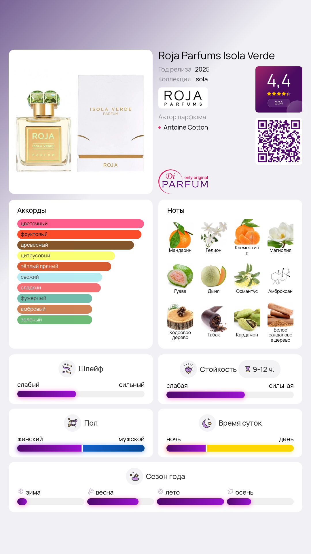 Isola Verde от Roja Dove — это ароматический фруктовый парфюм, созданный как для женщин, так и для мужчин. Этот новый аромат был представлен в 2025 году и разработан талантливым парфюмером Antoine Cotton.