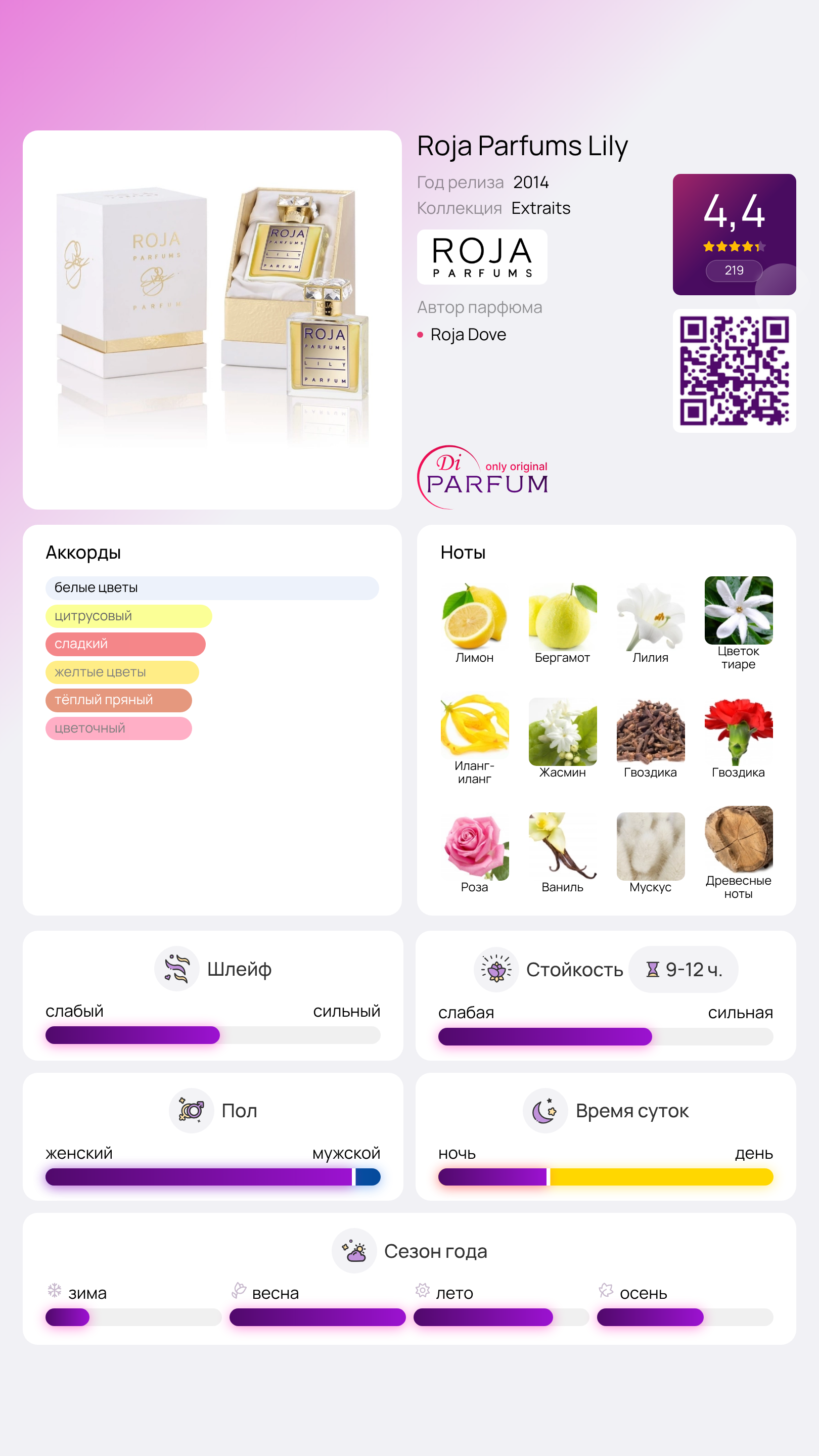 За ней следуют другие цветы: тиаре, роза, иланг-иланг, жасмин и гвоздика, причем парфюмер использовал необычное сочетание из цветка и специи в сердце аромата. Завершает композицию изысканная база с оттенками ванили, древесины и мускуса.