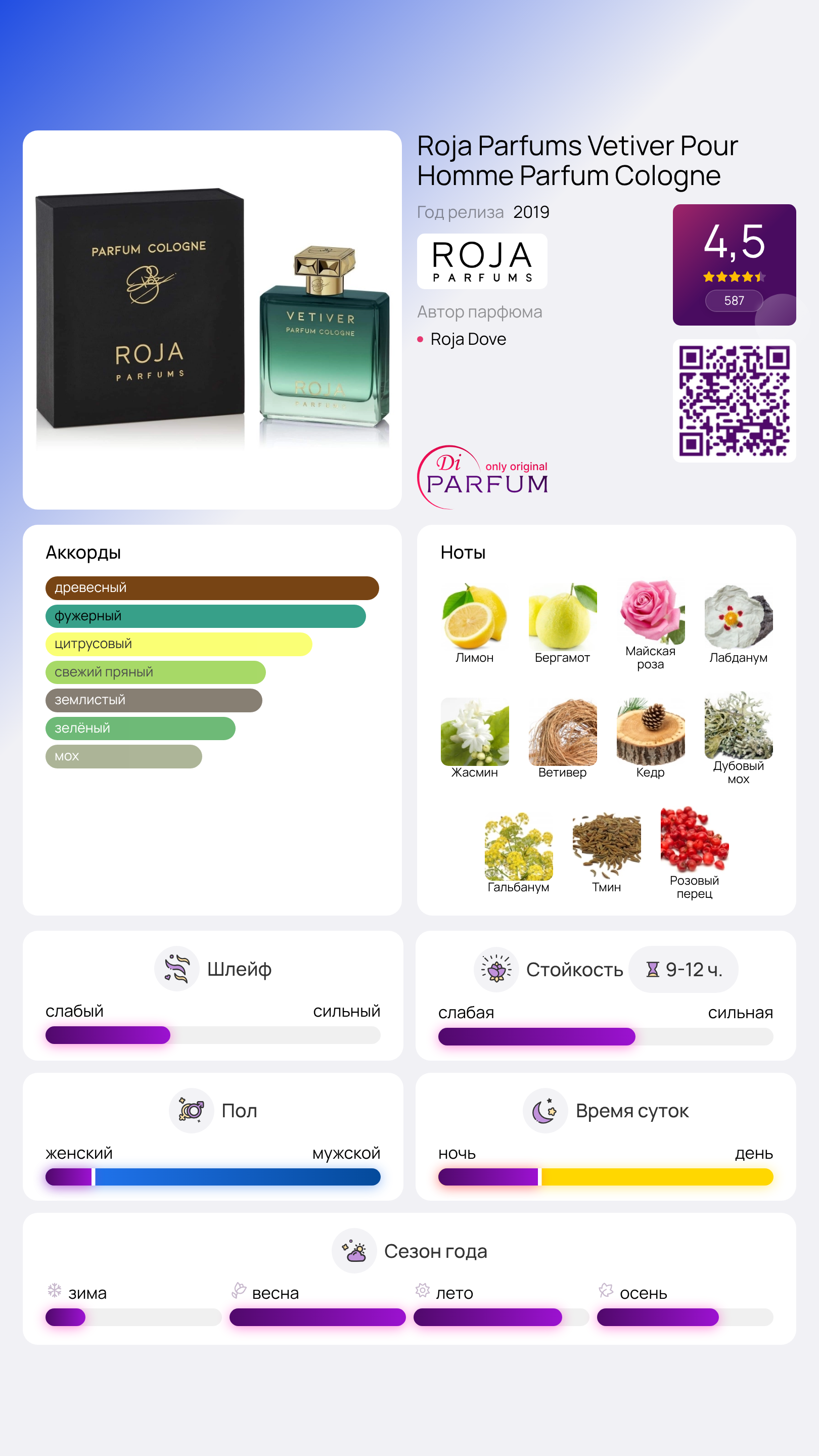 Роже Дав, известный парфюмер и создатель своего бренда, без тени сомнения назвал мужской парфюм Roja Parfums Vetiver Pour Homme Parfum Cologne, выпущенный в 2019 году, одним из самых выдающихся шипровых ароматов последних лет. Его великолепная композиция обыгрывает теплую и сухую нотку ветивера, который выделяется как уникальный ингредиент в мире парфюмерии.