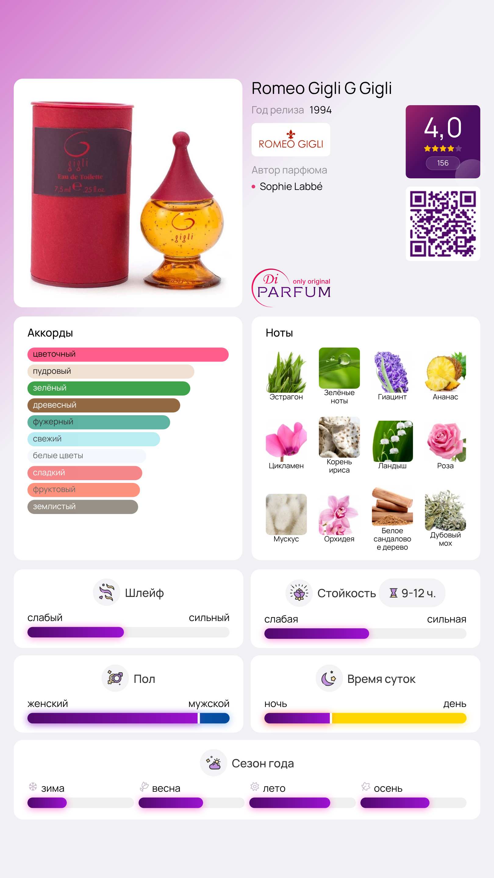 Аромат Romeo Gigli G Gigli представляет собой истинную парфюмерную классику, созданную для женщин, жаждущих быть в центре внимания. Его ноты способны отвлечь от повседневных забот, вселяя веру в лучшее и заполняя душу сладкими мечтами.