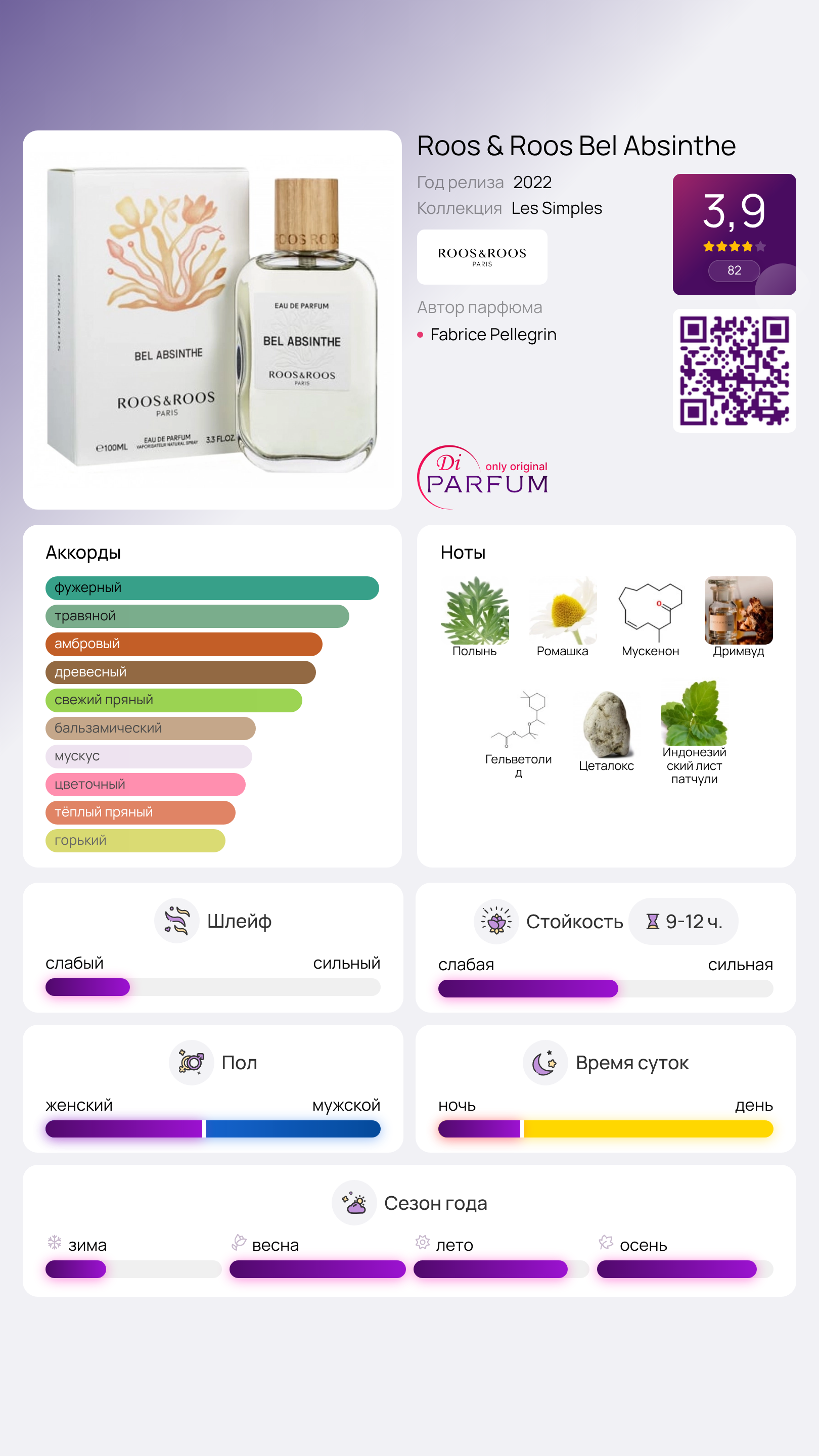 В шлейфе раскрываются насыщенные травяные и древесные оттенки индонезийского пачули. Завершает композицию сексуальный белый мускус и янтарное дерево. Roos & Roos с их парфюмом Bel Absinthe предлагают игривую композицию, ориентированную на творческих личностей, которые по своей сути являются бунтарями. Этот французский бренд также активно поддерживает женщин, перечисляя 10% своей прибыли в «Фонд женщин». Дебютировав в 2022 году, парфюмерная вода наилучшим образом раскрывается в теплое время года.