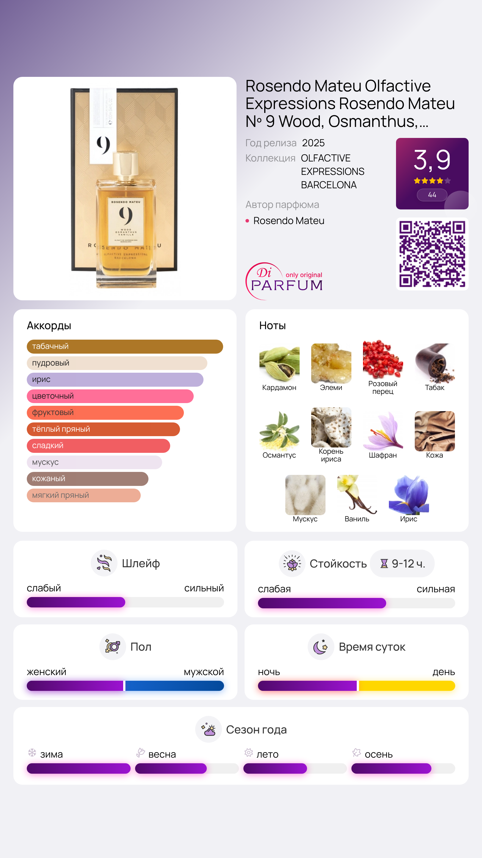 Rosendo Mateu Nº 9 Wood, Osmanthus, Vanilla от Rosendo Mateu Olfactive Expressions — это восточно-цветочный аромат, созданный как для женщин, так и для мужчин. Данная новинка была представлена в 2025 году, и за её создание отвечает известный парфюмер Rosendo Mateu. Верхние ноты аромата включают кардамон, элеми и розовый перец, которые создают яркое и запоминающееся начало. Сердце композиции состоит из табака, османтуса, корня ириса, шафрана и кожи, что придаёт аромату глубину и интригующую сложность. В завершении звучат базовые ноты мускуса, ванили и ириса, которые дарят чувственность и элегантность.
