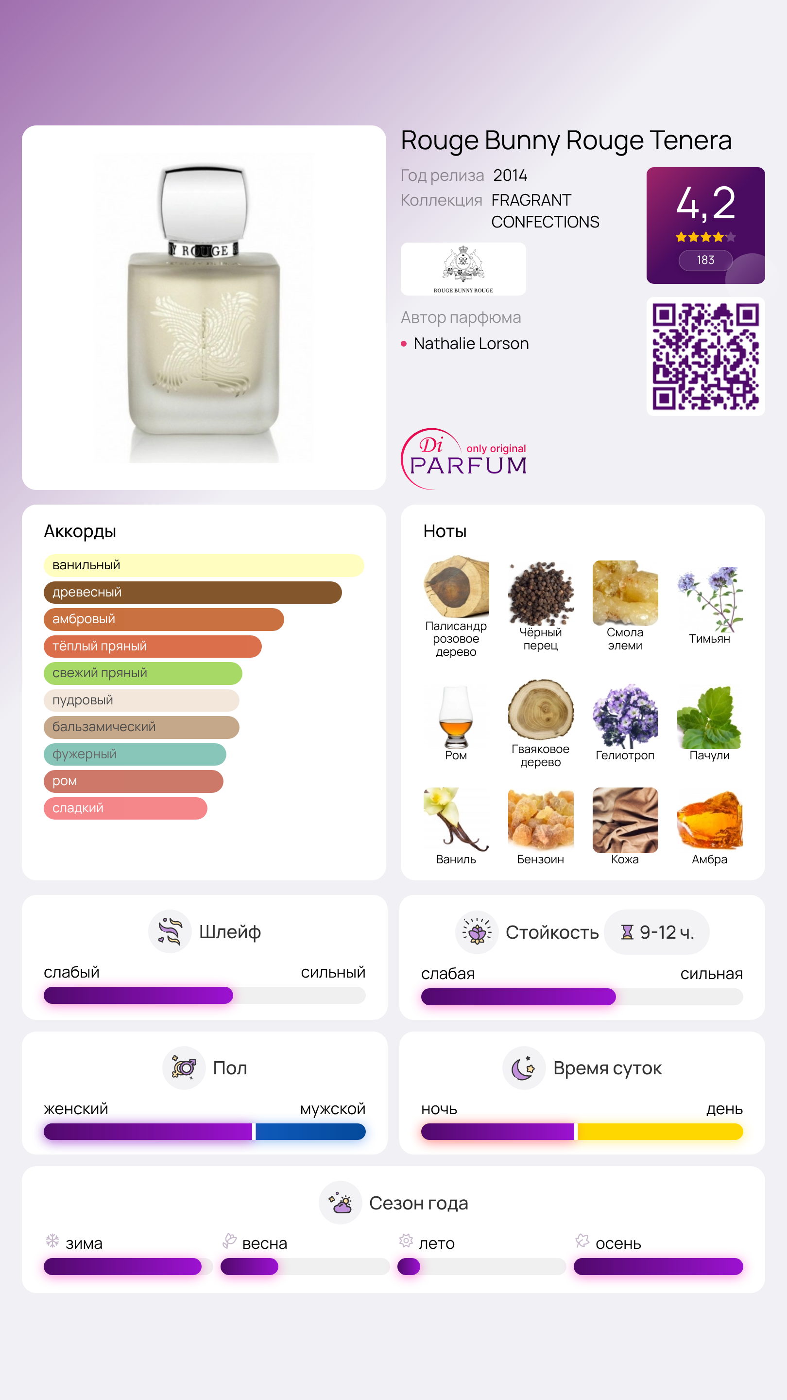 Парфюм Tenera передает все оттенки счастья. В его верхних нотах раскрываются акценты розового дерева, тимьяна и элеми, которые символизируют легкость и вдохновение, рождаемое мечтами и творчеством.