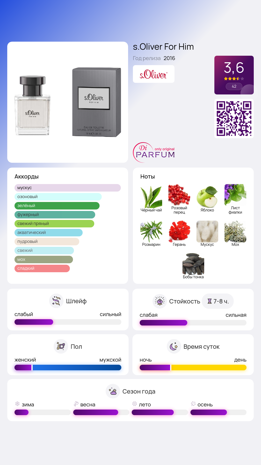 В 2016 году немецкий бренд S.Oliver представил аромат для мужчин под названием s.Oliver For Him. Этот элегантный и привлекательный парфюм стал отличным дополнением к женской версии аромата. Если в женском варианте доминирует роза, то в мужской интерпретации главные ноты принадлежат черному чаю и фиалковым листьям.