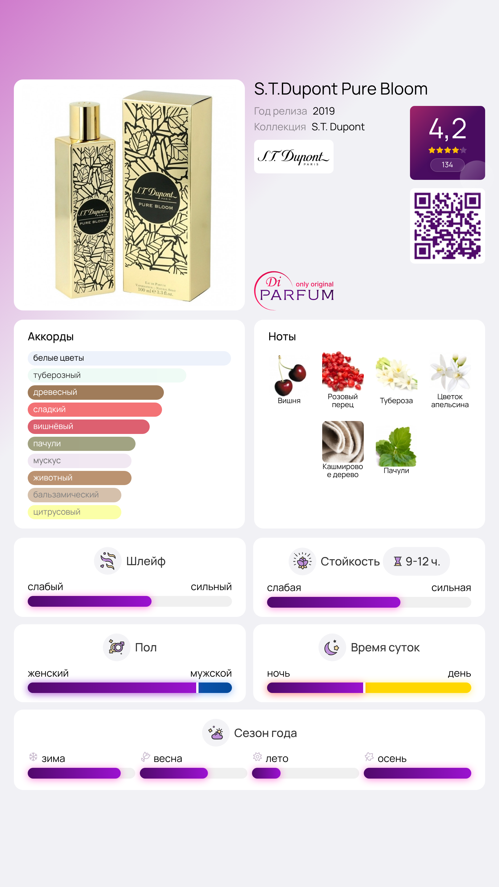S.T.Dupont Pure Bloom – это очаровательный цветочно-восточный женский парфюм от знаменитой французской нишевой марки «Дюпон», основавшейся в 1872 году как производитель кожаных изделий, а затем ставшей известным домом моды и роскоши. Название Pure Bloom можно перевести как «Чистый цветок». Аромат представлен в бутылке, выполненной в форме золотого слитка.