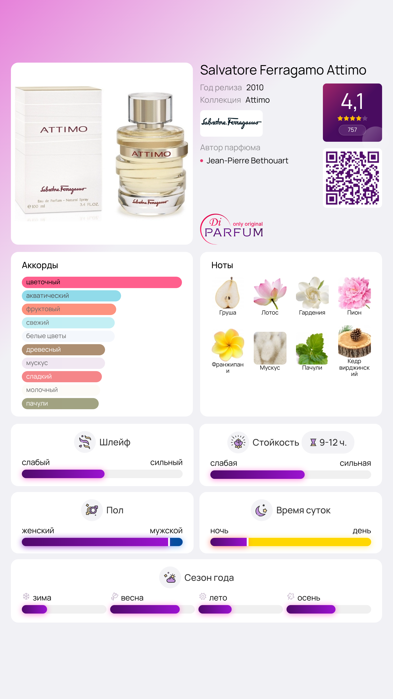 Salvatore Ferragamo играет с течением времени, стремясь не просто подчинить его, а улавливать его саму суть – мгновение! Его новое ароматическое творение, названное Attimo, не предлагает разделить вашу жизнь на самые важные и запоминающиеся моменты, а подчеркивает значение каждого мгновения. То, что сегодня кажется непреодолимым и сложным, завтра превратится в мелочь. Все, что огорчало и выбивало из равновесия, с приходом нового дня будет забыто, заменённое счастливыми событиями и радостными переживаниями. Attimo – это аромат положительных эмоций!