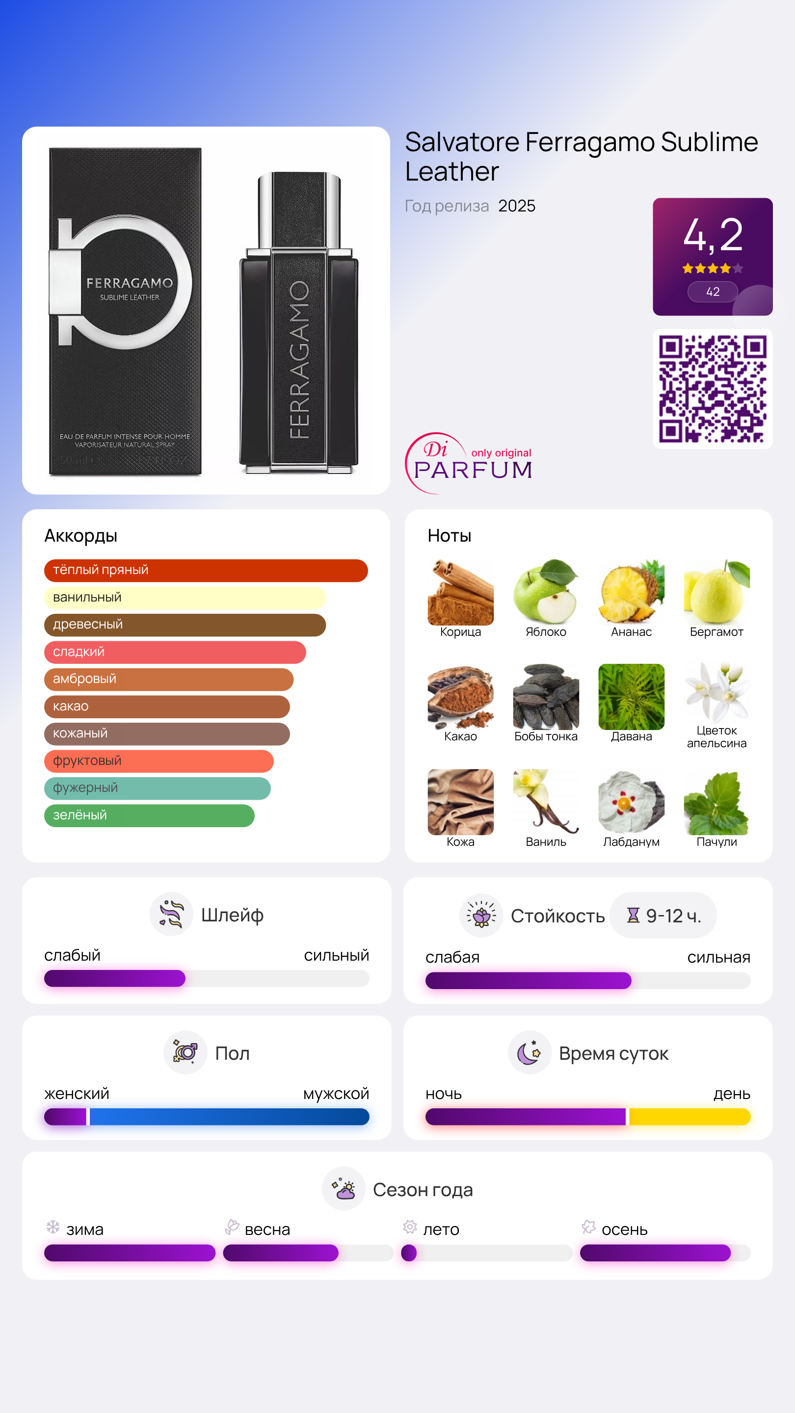Sublime Leather — это идеально сбалансированный аромат, который прекрасно подойдет как для повседневного использования, так и для особых случаев, когда нужно произвести впечатление. Его глубокий и утонченный характер подойдет настоящим ценителям качественной парфюмерии.