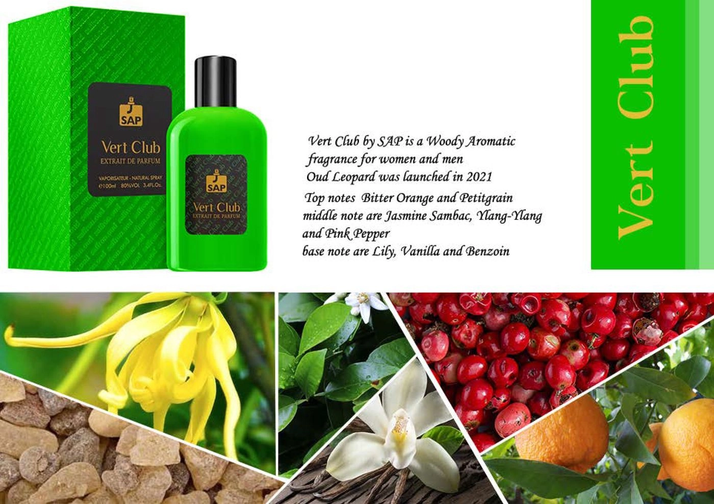 Искрящаяся композиция Vert Club от SAP Perfume ориентирована на тех, кто ценит свежие и эффектные ароматы. Она наполнена энергией и энтузиазмом, подчеркивая необходимость познания своего внутреннего мира. Духи в концентрации экстракта были выпущены известным арабским брендом в 2021 году, а стильный флакон окрашен в насыщенный зеленый цвет, отражая характер фужера.