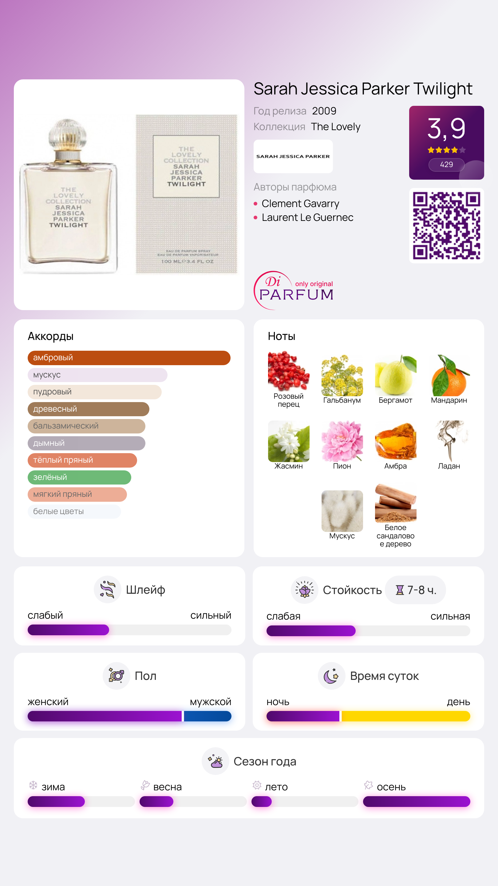 Twilight от Sarah Jessica Parker – это интимные, трогательные и личные духи с продолжительным шлейфом. Их звучание гармонично раскрывается благодаря нотам бергамота, мандарина, пиона, жасмина, сандалового дерева, амбры и мускуса.