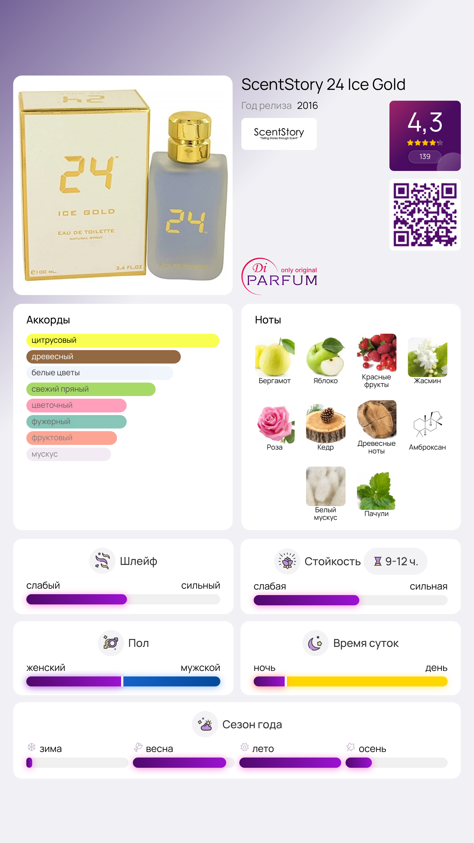 24 Ice Gold прекрасно подходит как для праздничных мероприятий, так и для офисной атмосферы. Яркая композиция была представлена в 2016 году в рамках арома-историй, посвященных сериалу "24 часа". Упаковка украшена логотипом, а туалетная вода ассоциируется с белым (холодным) золотом. Производитель – молодая американская марка.