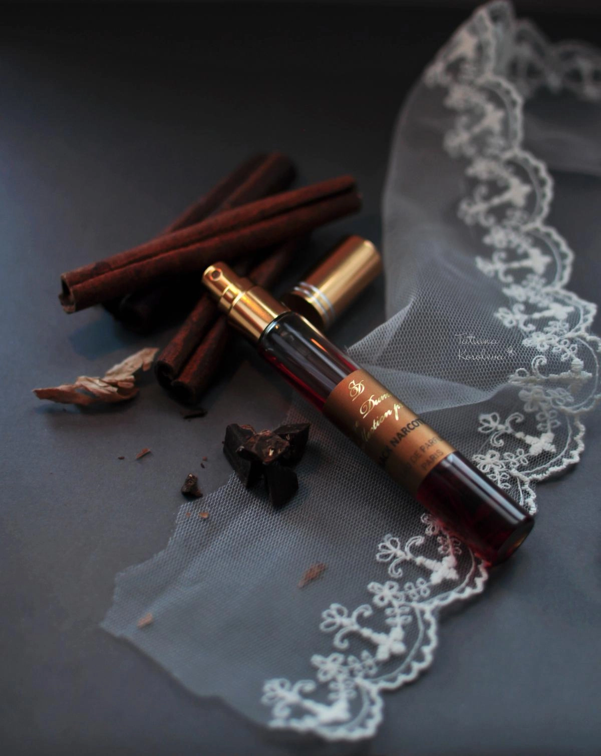 Ольфакторная пирамида Black Narcotique открывается мощным аккордом, сочетающим теплые ноты коньяка с томными оттенками корицы и чувственными полутоновыми нюансами темного шоколада. В сердце композиции выделяется пикантный миндаль, который гармонично подчеркивается медовой сладостью и дымным древесным оттенком.