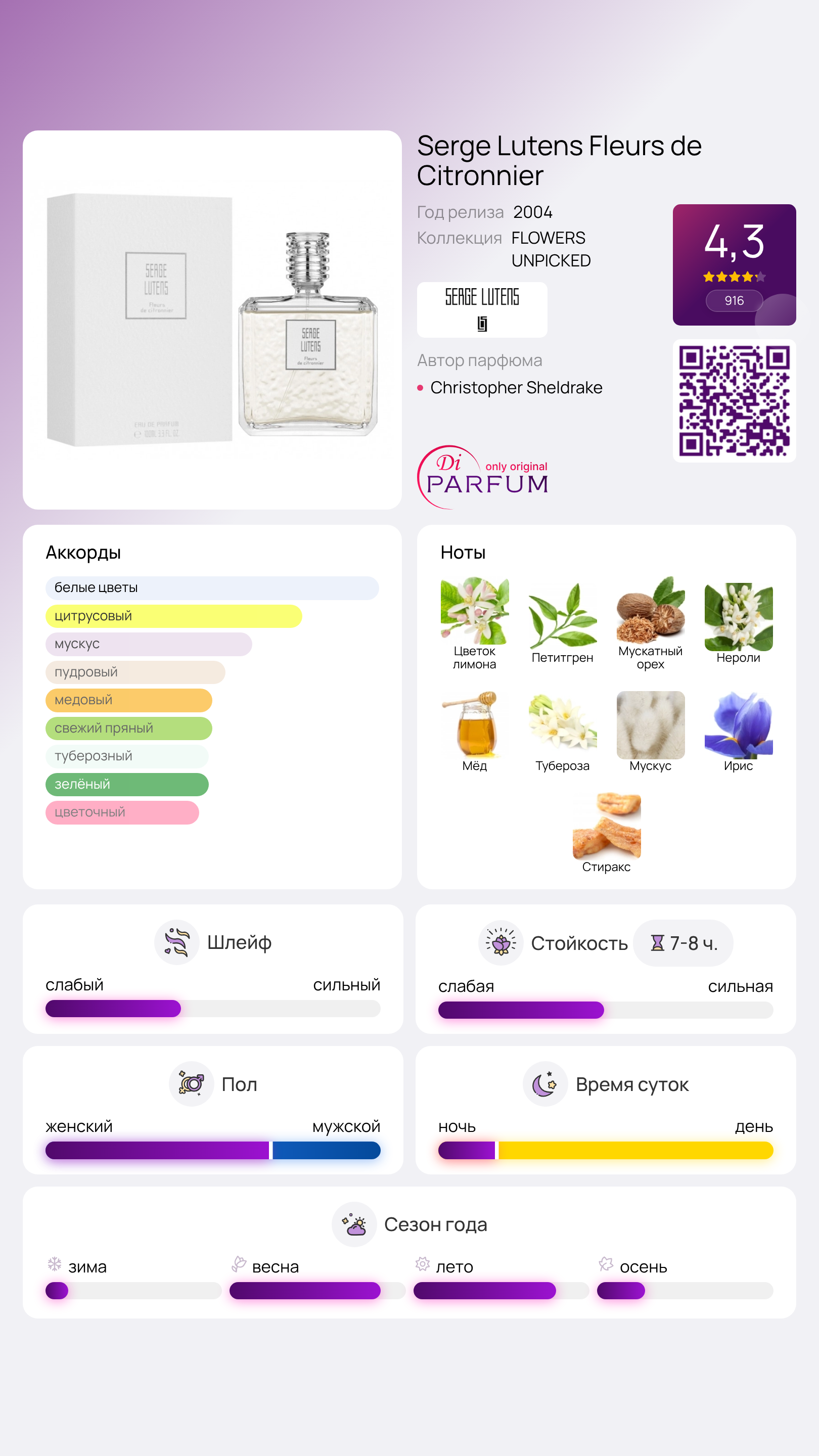 Аромат Fleurs d’Citronnier от Serge Lutens является отличным примером такого гармоничного и классического, но при этом несложного парфюмерного творения, где каждый компонент имеет возможность проявиться в полной мере.