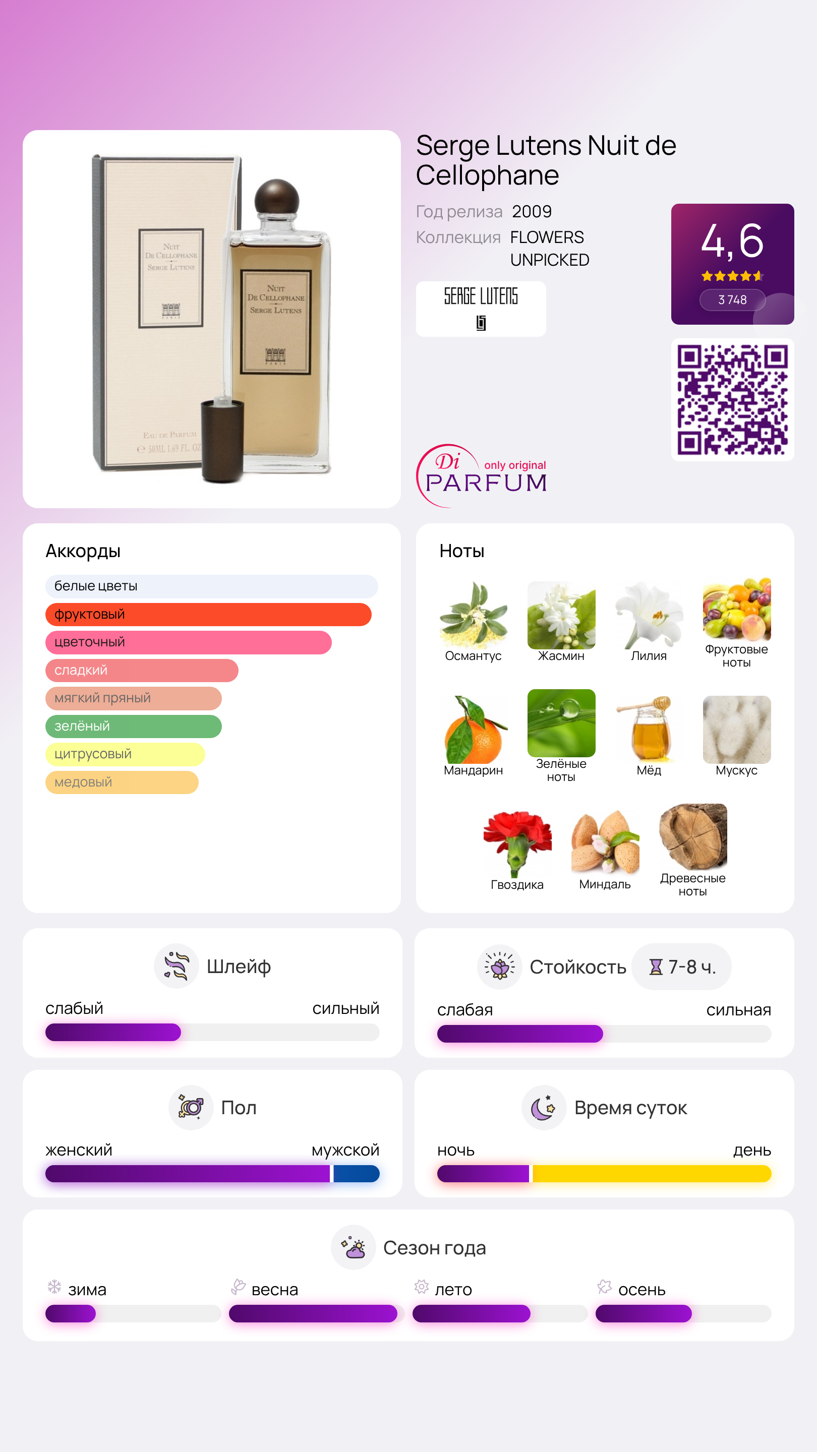 Ночь — это удивительное время, которое словно одето в нарядную оболочку. Nuit de Cellophane от Serge Lutens — это парфюм, способный поразить воображение, пробудить чувства и заставить мечтать.