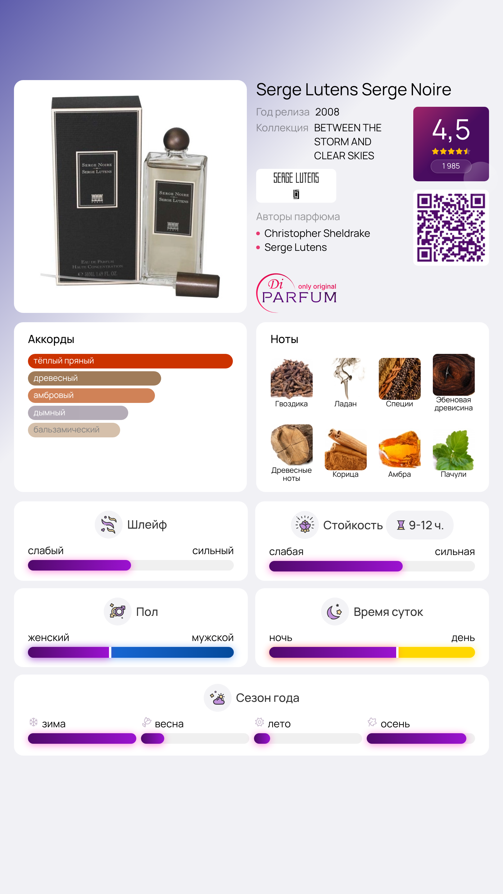 Serge Noire – это аромат, созданный выдающимся парфюмером Serge Lutens. Этот парфюм представляет собой дань не самому себе, а таинственному и чувственному черному шелку, который дарит нежность и соблазн, обнимая вас своими нотами.