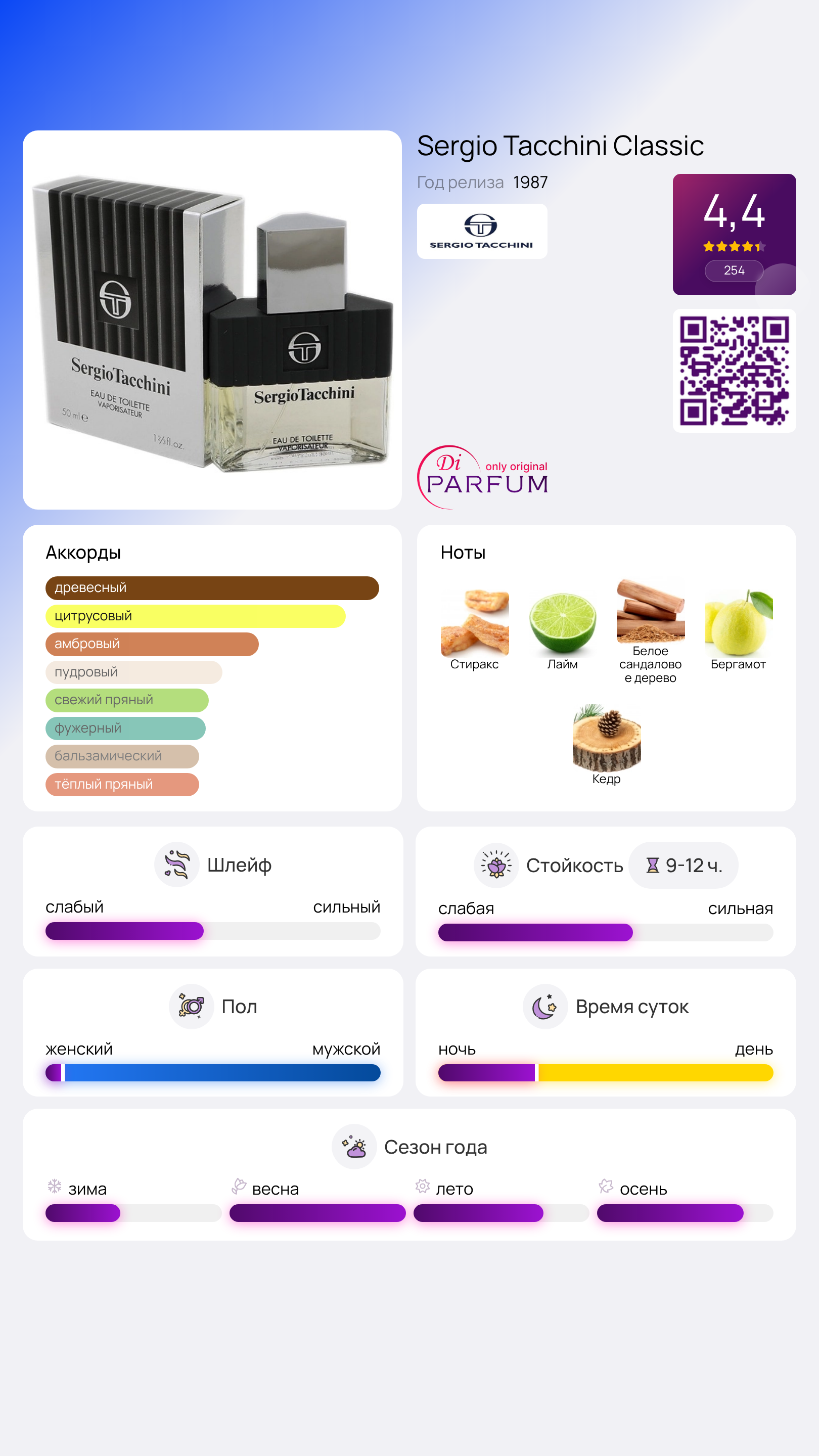 Аромат Sergio Tacchini Classic представляет собой классический фужерный запах, сравнимый с качественно сшитым и недорогим мужским костюмом. Он начинается с ярких цитрусовых нот, приправленных специями, которые плавно переходят в освежающий хвойный аккорд. Этот «темный конь» продолжает удивлять, оставаясь востребованным со дня своего создания в 197 году.