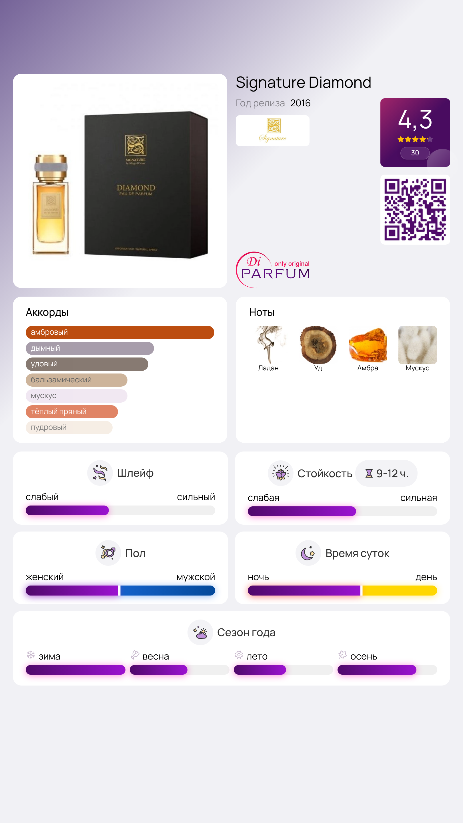 О нем сложены многие мифы и легенды, он является символом древних сказаний, а также самым желанным и ценным представителем среди женщин — это Его Высочество Бриллиант. Именно ему посвящена изысканная композиция арабского бренда Signature Diamond. По древнему преданию, алмаз считается божественным материалом, использованным богами для создания небес, однако одна капля упала на Землю. С греческого языка название этого драгоценного камня переводится как "непреодолимый". Создатели аромата стремились передать эту идею, вбирая в него божественную силу, ослепительный блеск и великолепие.