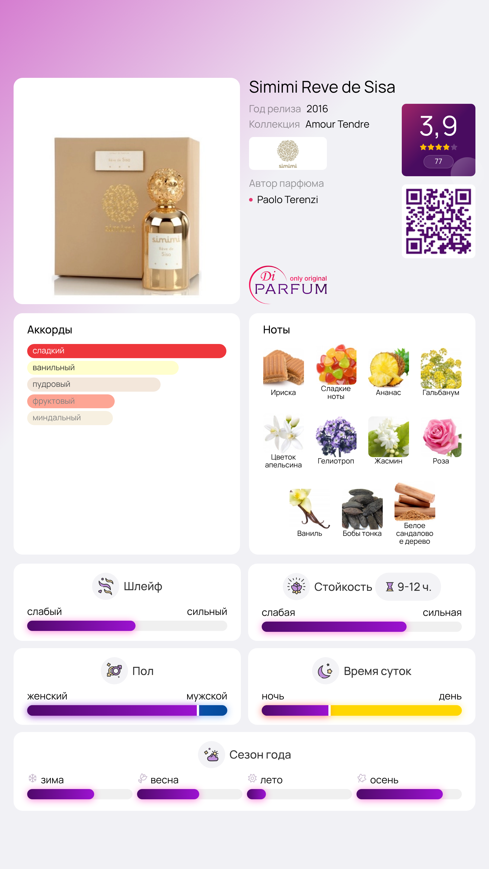 В базе сладкий аккорд продолжает присутствовать в виде облака ванили, экзотических бобов тонка и молочной ириски. Завершают этот ароматный шедевр мускус и сандал, создавая узнаваемый и запоминающийся шлейф Simimi Reve de Sisa.