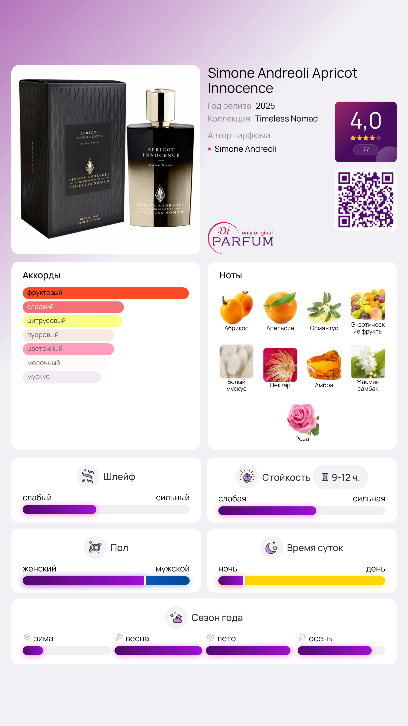 Apricot Innocence от Simone Andreoli — это потрясающий аромат Floral Fruity, созданный как для женщин, так и для мужчин. Данный парфюм был выпущен в 2025 году и является новинкой в мире парфюмерии. За его создание отвечает известный парфюмер Симон Андреоли, который уже успел зарекомендовать себя в индустрии благодаря уникальным и запоминающимся ароматам.