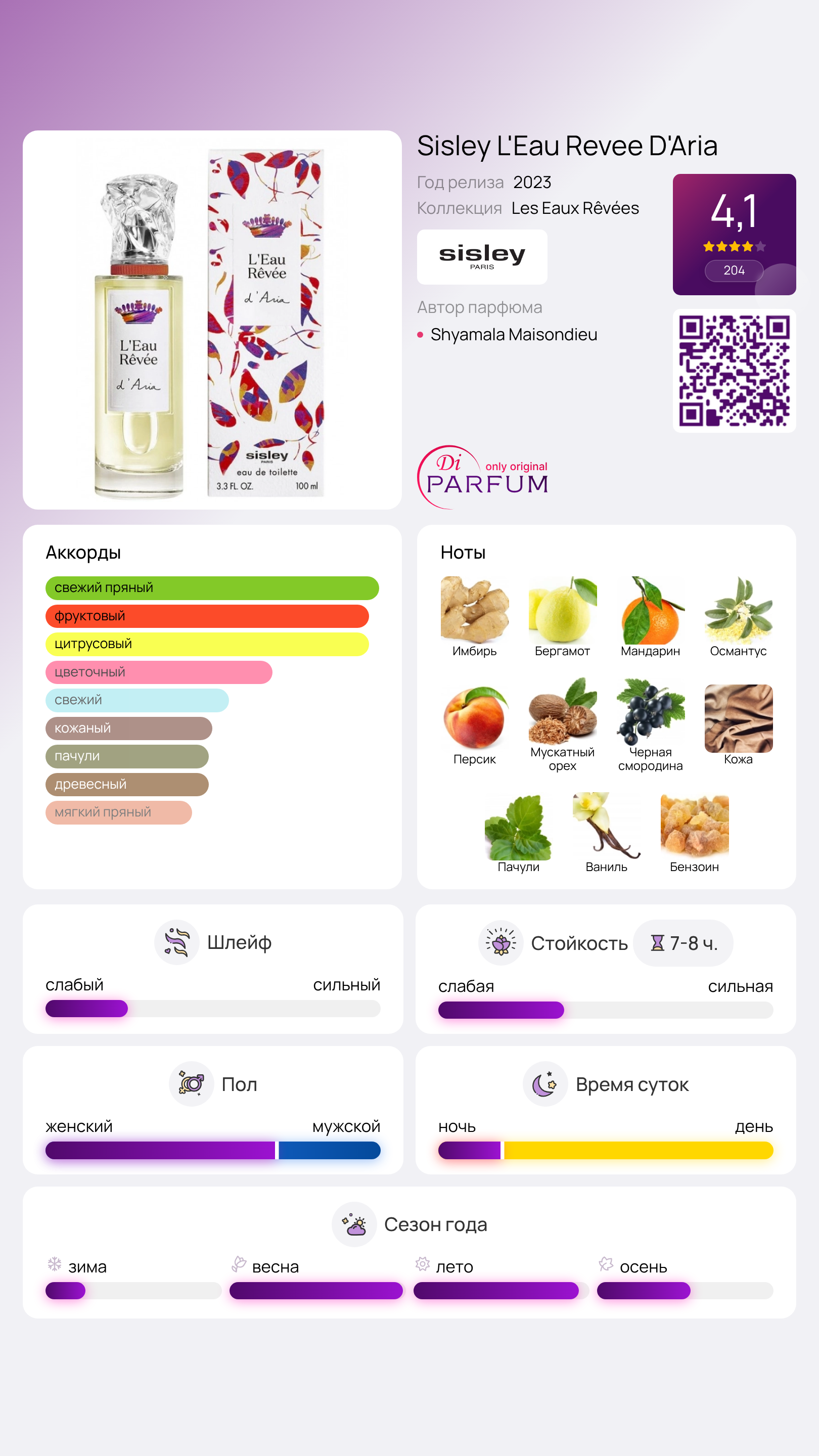 После этого на первый план выходит насыщенный аромат османтуса, украшенный сладковатыми нотами персика, черной смородины и деликатным мускатным орехом. Фруктовый акцент переплетается с цветочными оттенками, создавая насыщенное и привлеченное звучание. Завершает этот чувственный танец теплый аромат кожи, окруженный земными пачули, прозрачным бензоином и сладковатой ванилью. Разработку элегантного дизайна Sisley L'Eau Revee D'Aria осуществили Эльжбета Радзивилл и Бронислав Кшиштоф.