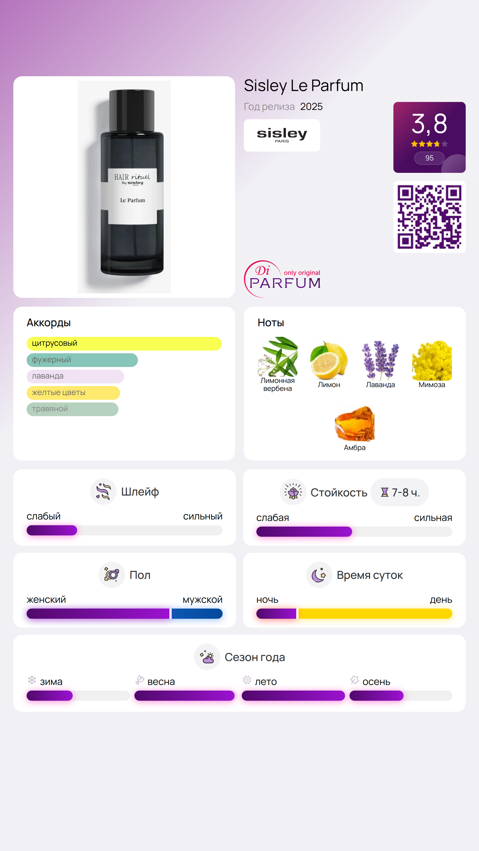 Le Parfum от Sisley — это цитрусово-ароматический парфюм для женщин и мужчин, который был представлен в 2025 году. Этот новый аромат сочетает в себе свежесть и энергетику, благодаря чему идеально подходит для любого времени суток. В верхних нотах вы чувствуете восхитительные аккорды вербены, лимона и лаванды, которые создают яркое и жизнерадостное начало. Сердце аромата раскрывается гармонией мимозы, а база наполняет композиций теплотой амбры.