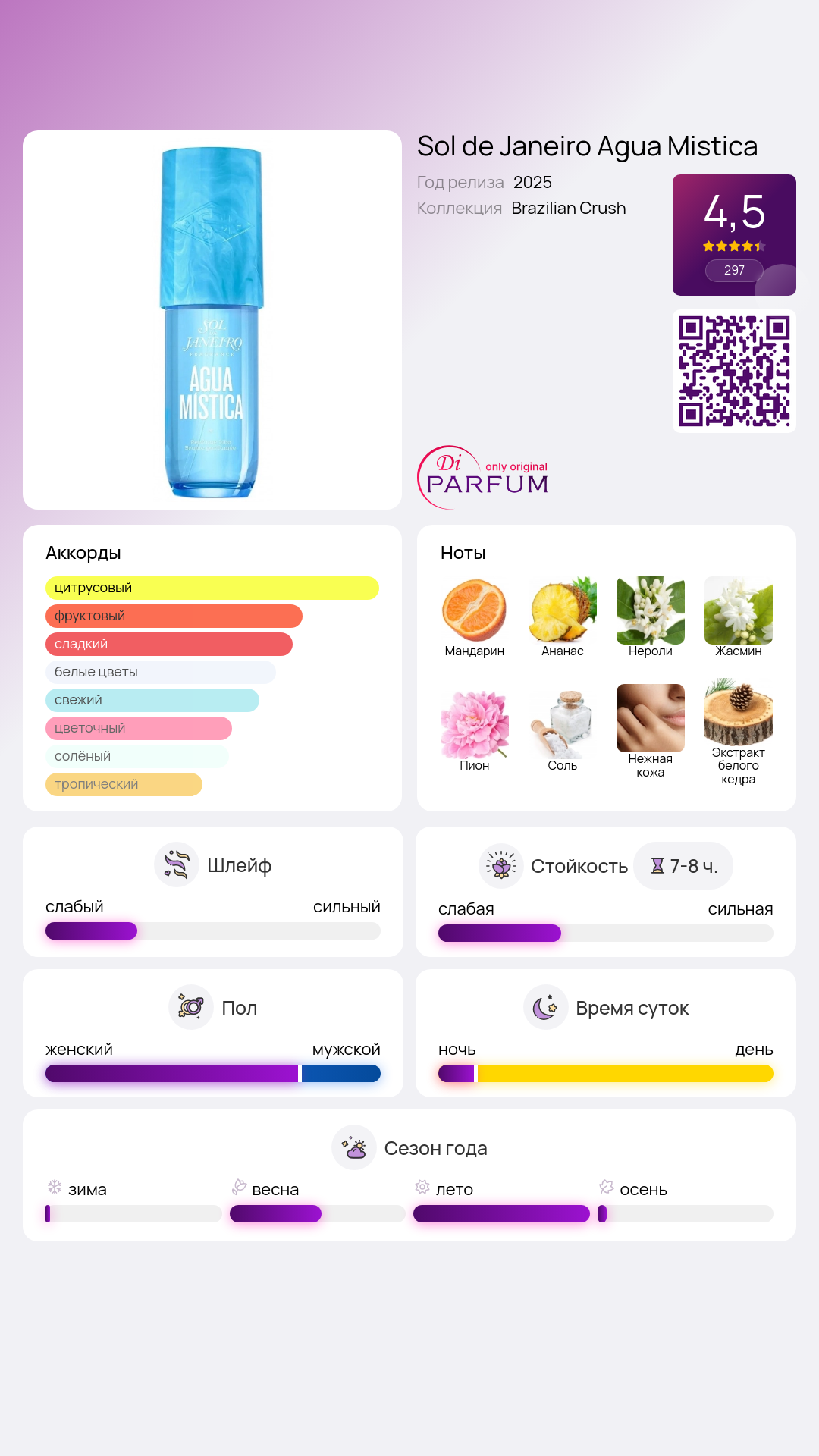 Этот аромат идеально подойдет для летних дней и атмосферных вечеров, когда вы хотите чувствовать себя легко и уверенно. Água Mística — это не просто парфюм, это целый опыт, который переносит вас в тропический рай, позволяя наслаждаться каждым мгновением.