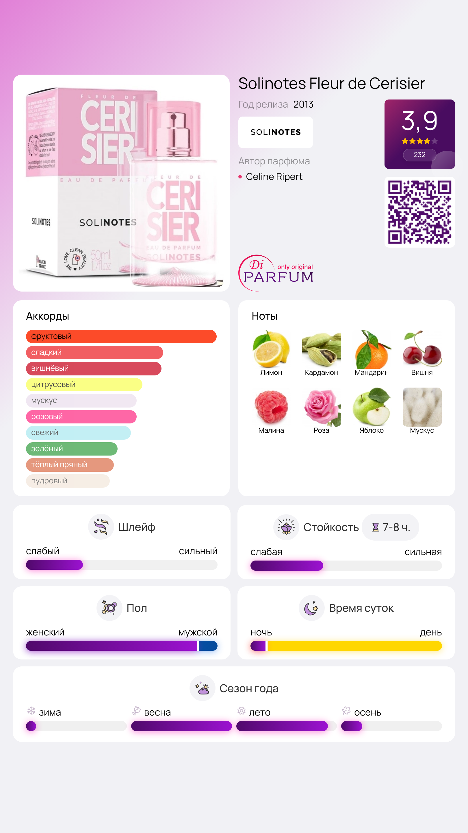 Аромат Solinotes Fleur de Cerisier представляет собой свежий цветочно-фруктовый эликсир, на основе сладкого вишневого леденца и цветущей вишни, который можно сочетать с другими запахами из коллекции. Чтобы добавить нотку соблазна, попробуйте смешать его с жасмином, для придания элегантности используйте ваниль, а для создания очарования – гранат.