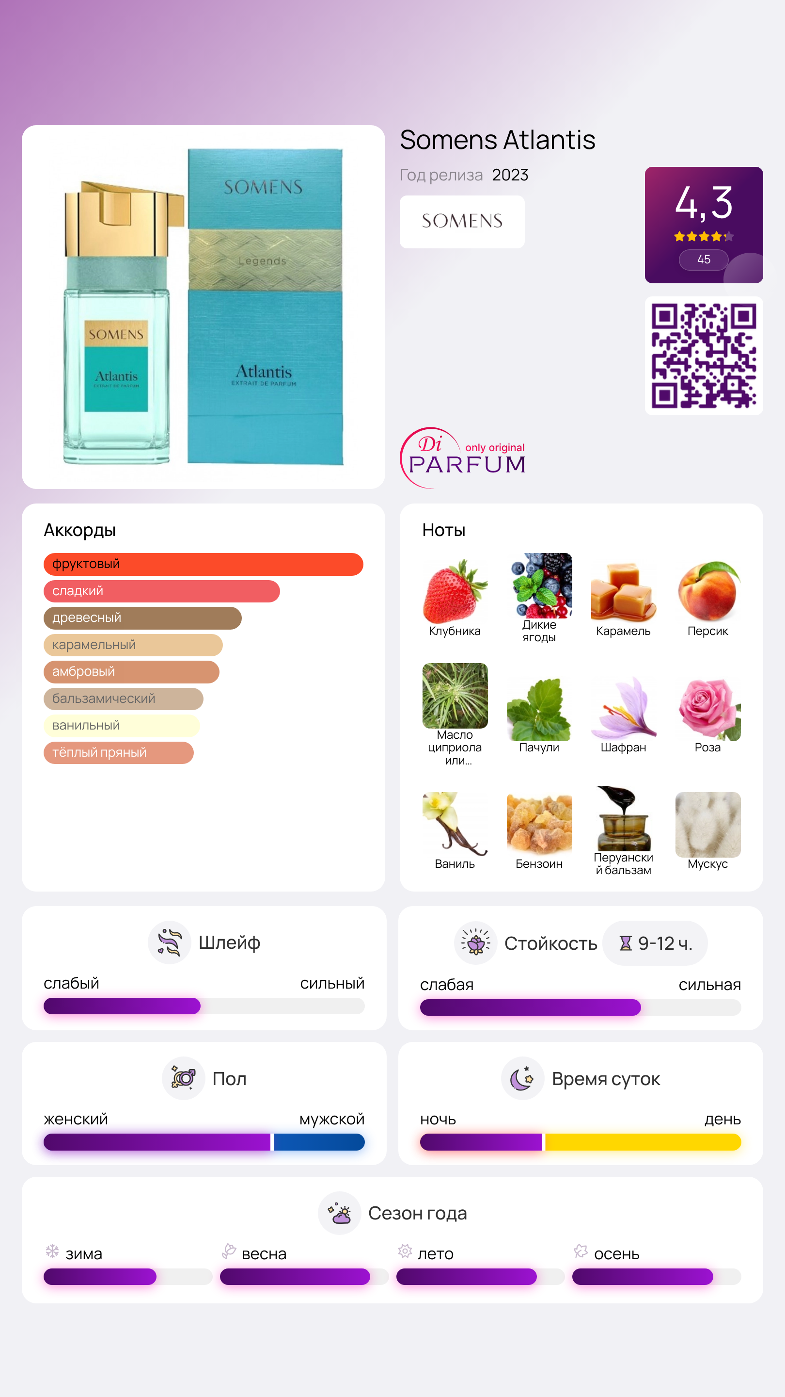 Ароматная композиция притягивает с помощью сладких нот клубники и ягод, дополненных бархатистым персиком и карамелью, приправленных сладким розовым перцем. В качестве фона выступает амбра с бальзамическим лабданумом, а сердце будет охвачено шлейфом шафрана и острым имбирем. Дымный уд, янтарный перуанский бальзам, смолистый бензоин и ванильный мускус создают завораживающий шлейф.