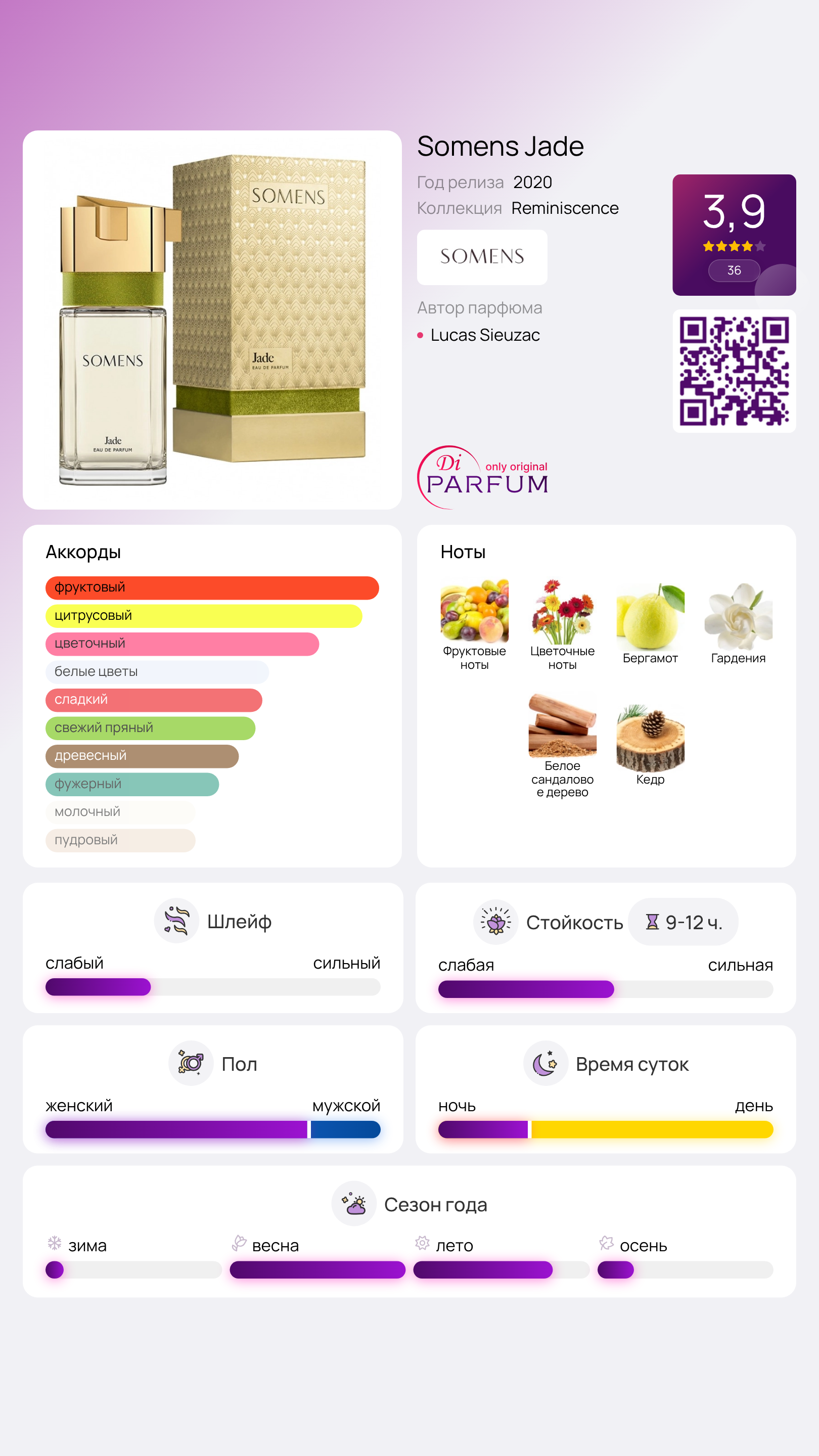 Глубокий шлейф аромата аккуратно сочетает сливочные оттенки сандала и смолистую дымность кедрового дерева. Теплая композиция Jade от Somens вдохновляет мужчин и женщин на реализацию своих идей, выступая как связь между человеком и миром ароматов. Выпущенная в 2020 году, эта парфюмерная вода была создана испанским брендом, который делает акцент на использование натуральных ингредиентов.