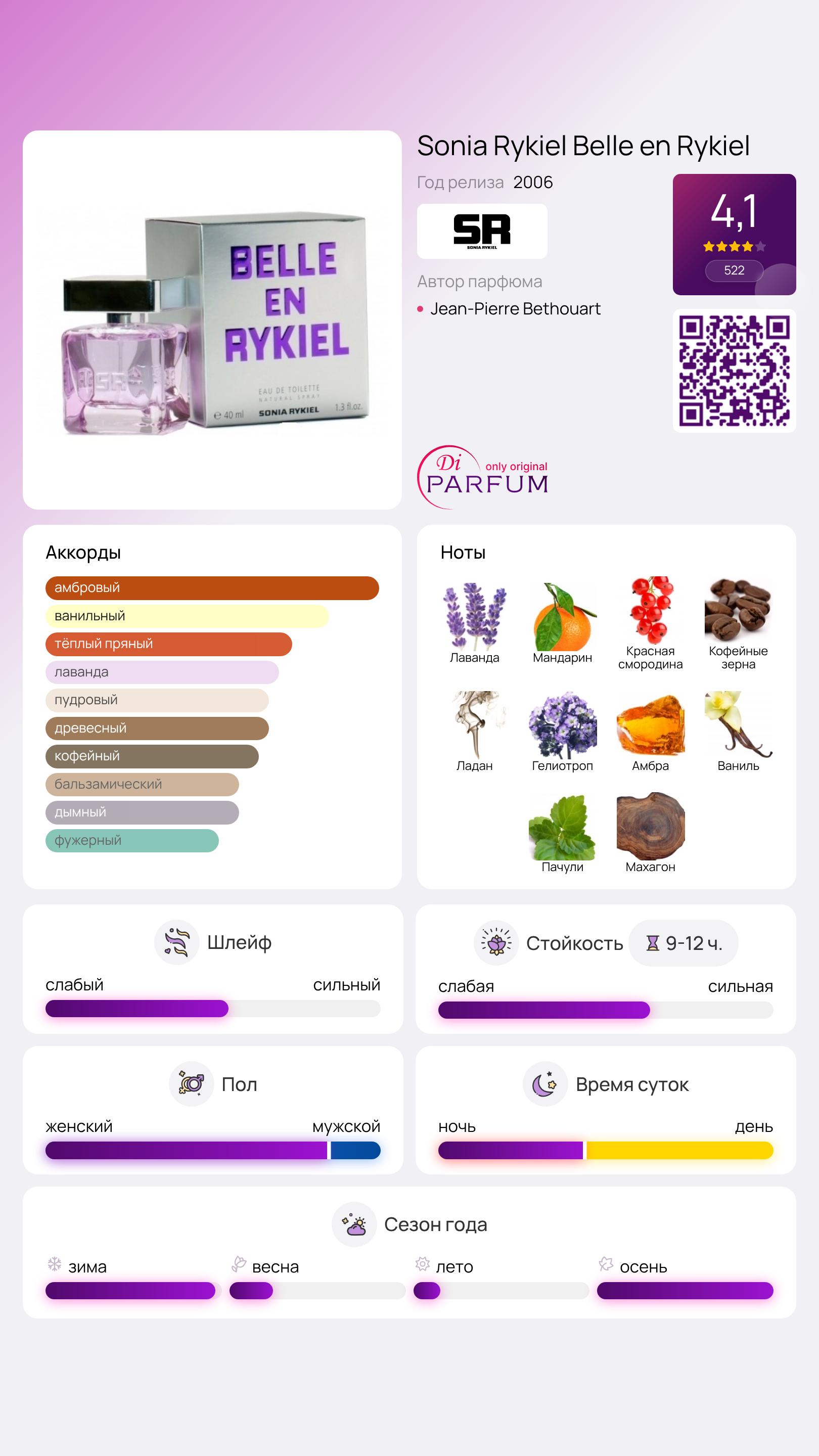 Фруктовые аккорды мандарина и лаванды придают аромату свежесть и легкость, в то время как ладан и гелиотроп добавляют Belle en Rykiel нотки элегантности и утонченности.