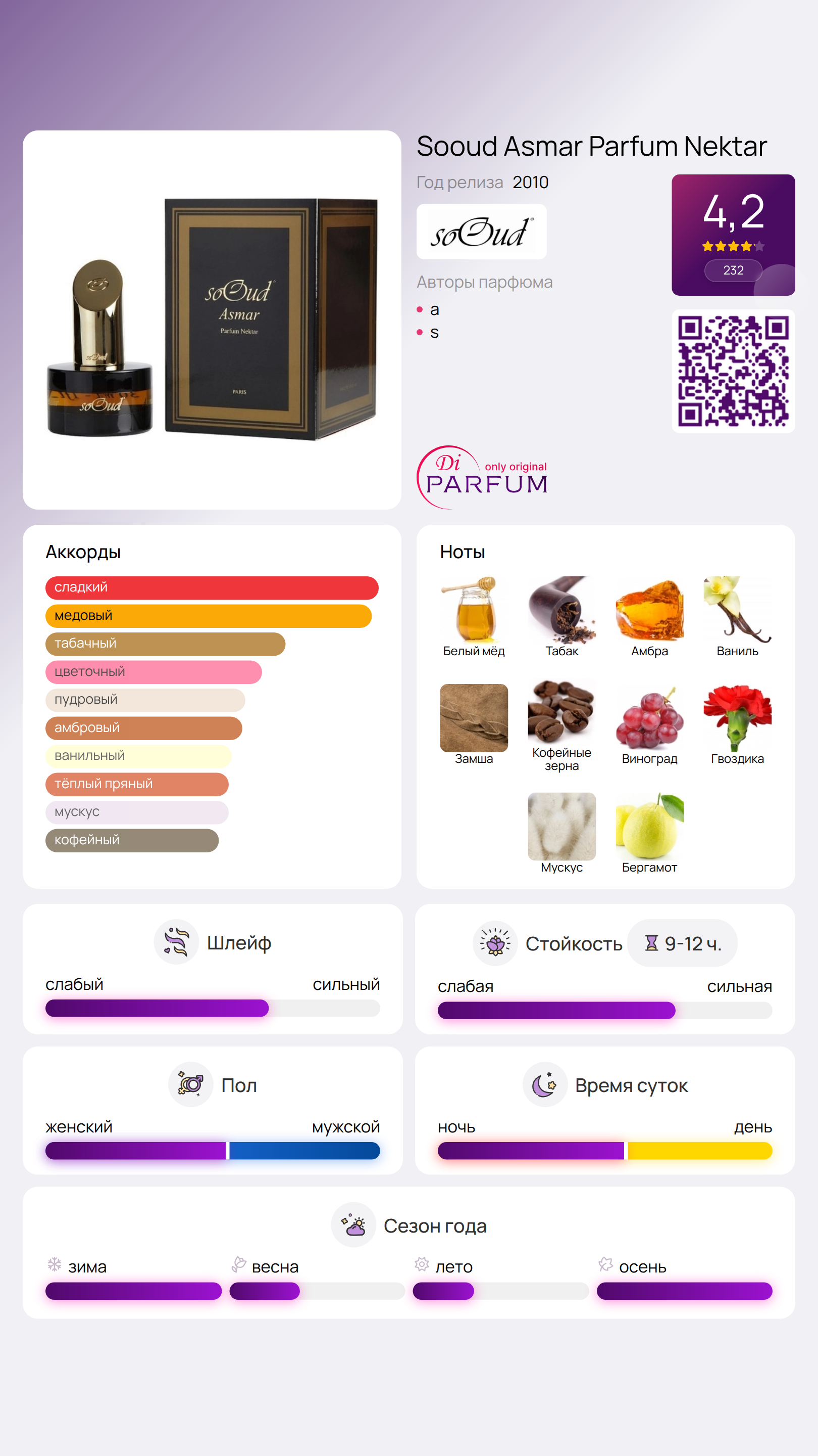 Asmar Parfum Nektar – это унисекс аромат, созданный парфюмерной компанией SoOud и вышедший на рынок в 2010 году. Он принадлежит к восточной пряной категории, предоставляя уникальное обаяние с первых ноток в черном флаконе, украшенном золотой крышкой и поясом.