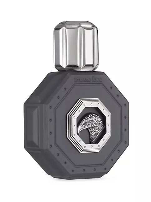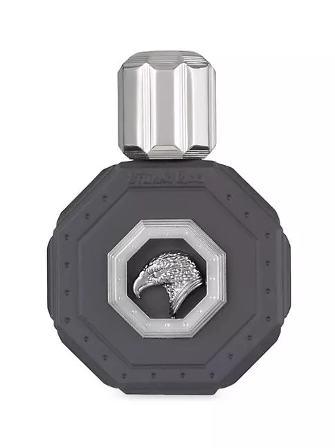 Флакон в угольно-черном цвете выполнен в 100% мужском стиле и является настоящим произведением парфюмерного искусства. Этот массивный восьмиугольный сосуд обрамлен серебряными деталями с камнями, а в центре расположен изображение орла, символизирующего свободу и независимость. Он аккуратно размещен на бархатной подложке элегантного футляра, что делает его отличным подарком для мужчин.