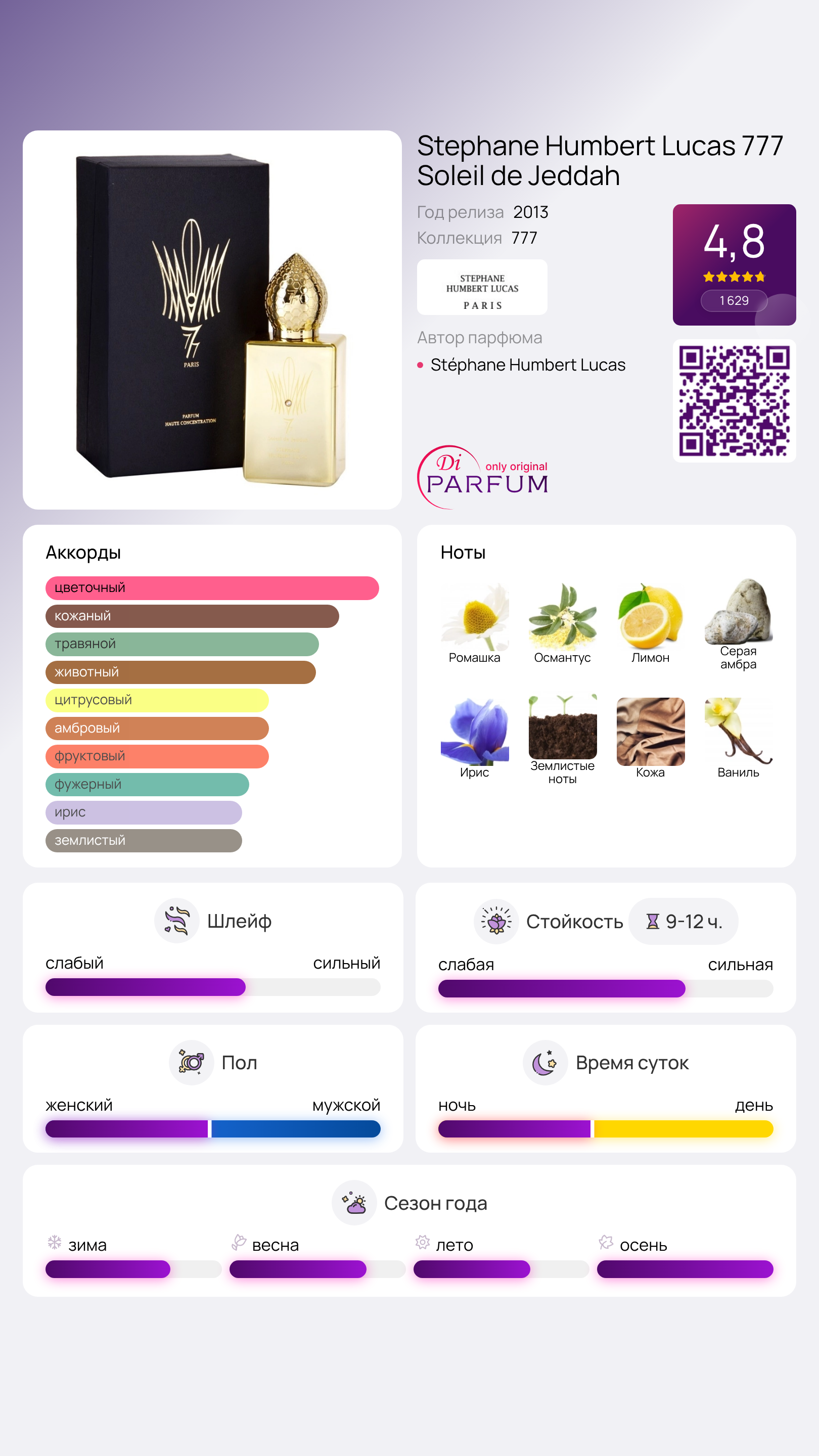 Эта парфюмерная новинка относится к кожаной категории и обладает сложной, густой и притягательной композицией. Несмотря на то, что начальным аккордом является казалось бы простая ромашка, она проявляется вместе с османтусом и лимоном уже с первых нот. В сердце аромата гармонично переплетаются серая амбра и ирис, а в базовых нотах ярко звучит кожа, дополненная сладкой ванилью и легкими нюансами пудрового ириса, унаследованного из сердечных аккордов.