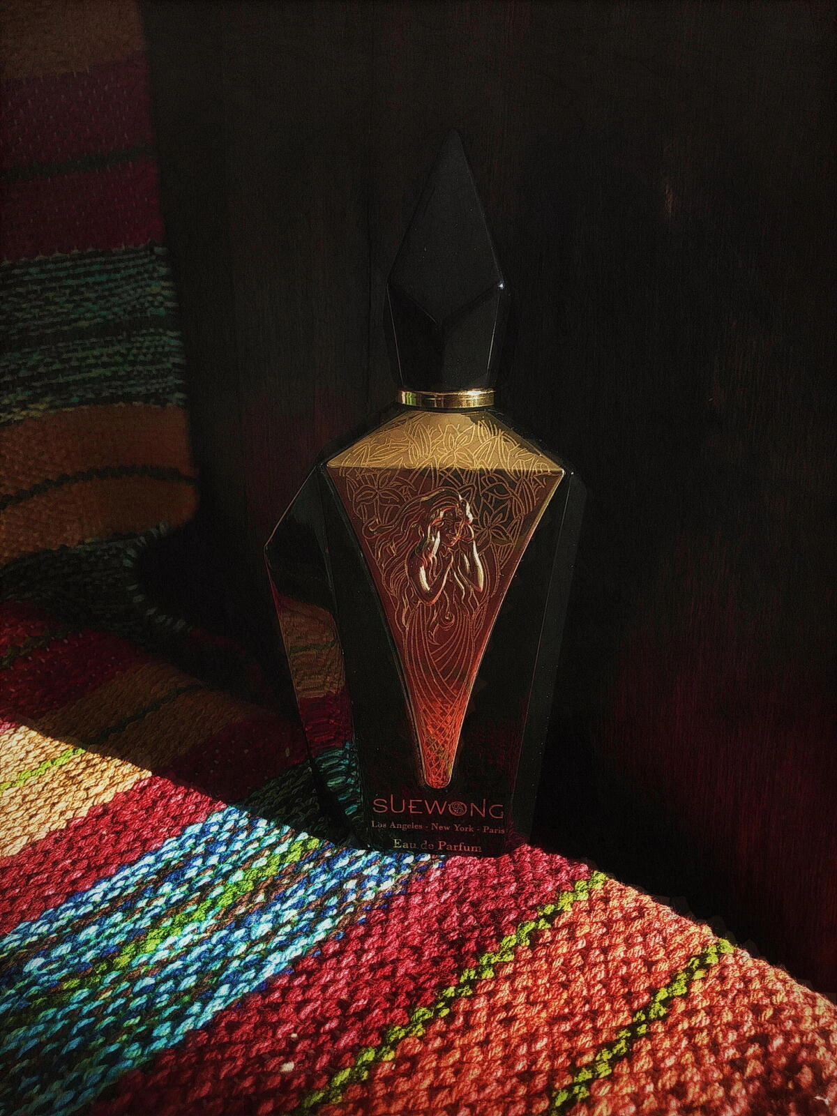 Аромат Sue Wong принадлежит к категории восточных древесных композиций. Нос Pierre Negrin создал верхние ноты из смеси апельсина, бергамота, водяных аккордов, белой фрезии, розового перца и грейпфрута. Сердце аромата составляет белый персик, окружённый нотами ириса, ландыша и жасмина самбак. В шлейфе можно уловить классические аккорды пачули, мускуса, ванили, амбры и белого кедра.