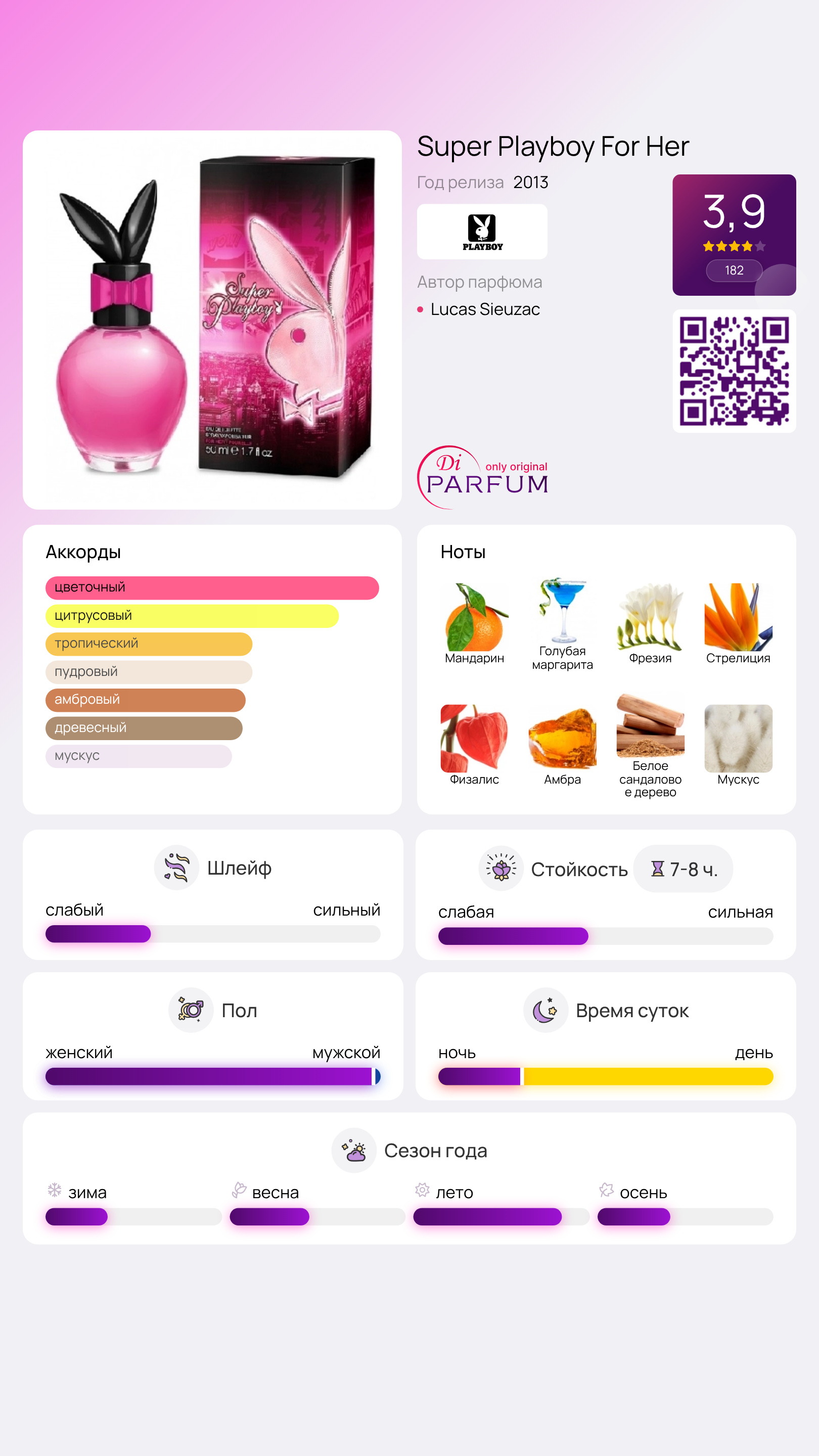 Бренд Playboy олицетворяет свободу и сексуальность, что делает женский аромат Super Playboy For Her ярким и притягательным. Его свежее начало открывается нотами коктейля Маргарита и сочного мандарина, создавая мгновенное ощущение энергичности. В сердечных нотах соединяются ароматы цветка Райской Птицы, фрезии и физалиса, добавляя композиции романтики. Завершающие аккорды состоят из мускуса, сандала и амбры, создавая чувственный шлейф. Флакон Super Playboy For Her выполнен в оригинальном фиолетовом цвете и украшен заячьими ушками, что делает его идеальным выбором для вечеринок и летних вечеров.