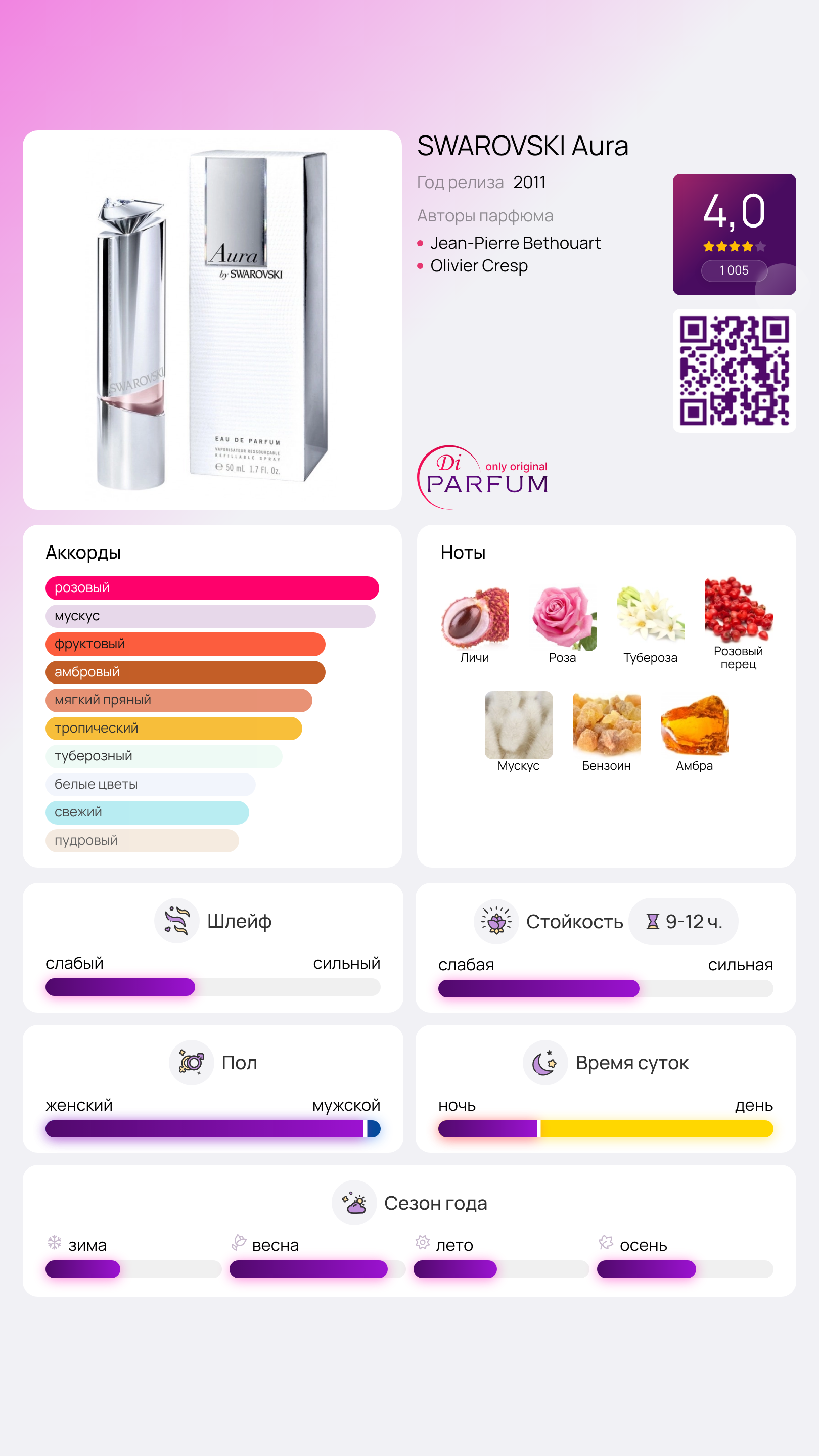 Таким образом, парфюм "Аура" от бренда Сваровски идеально дополняет образ женщины, излучающей яркость и красоту. Аромат был представлен публике в 2011 году.