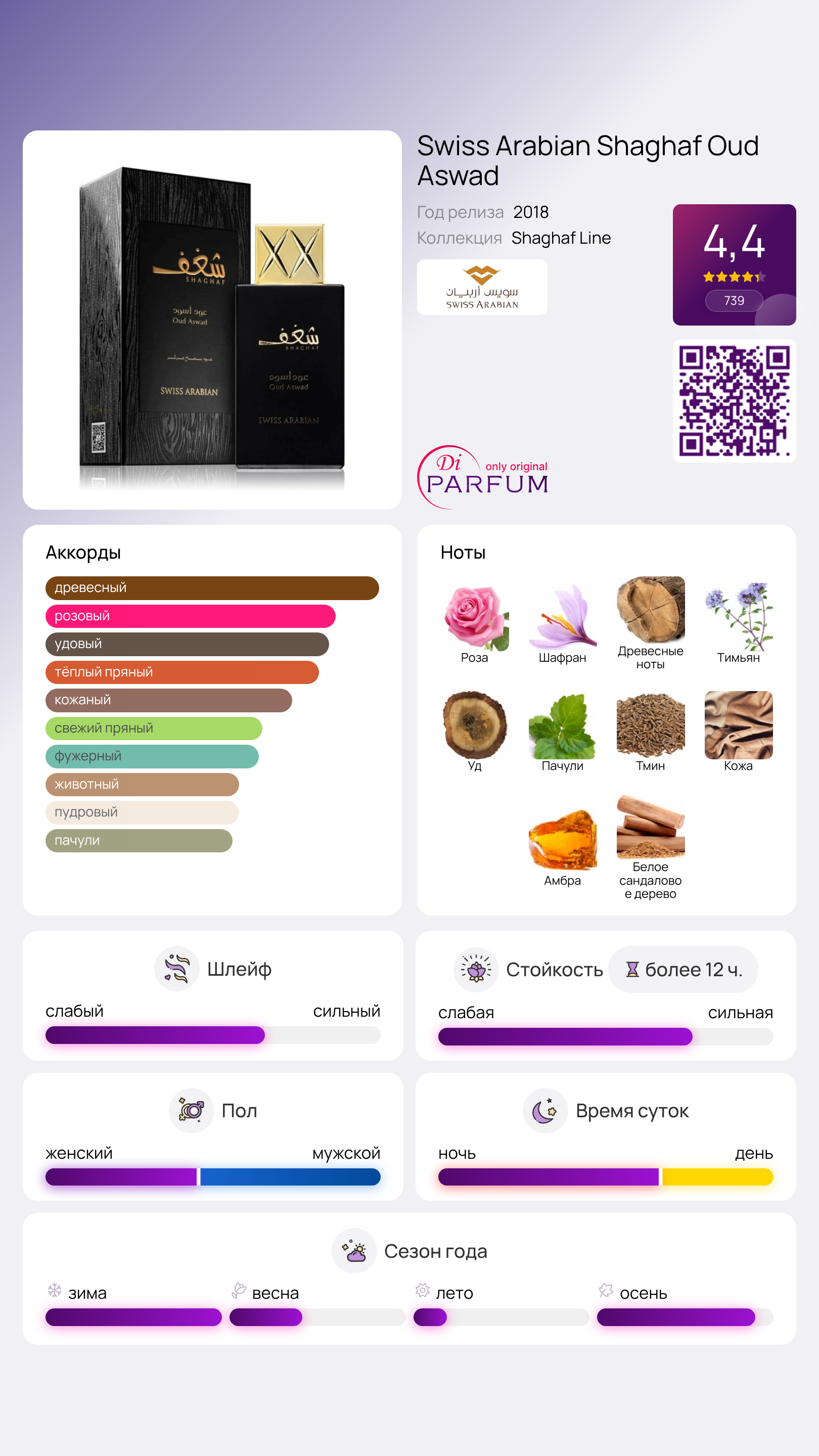 Восточное очарование и завораживающая глубина священного находятся в новых интерпретациях парфюмерии, благодаря унисексовому аромату Swiss Arabian Shaghaf Oud Aswad. Создатели этого популярного нишевого бренда из Объединенных Арабских Эмиратов смогли передать комплексность агарового дерева и объединить его с другими великолепными компонентами.