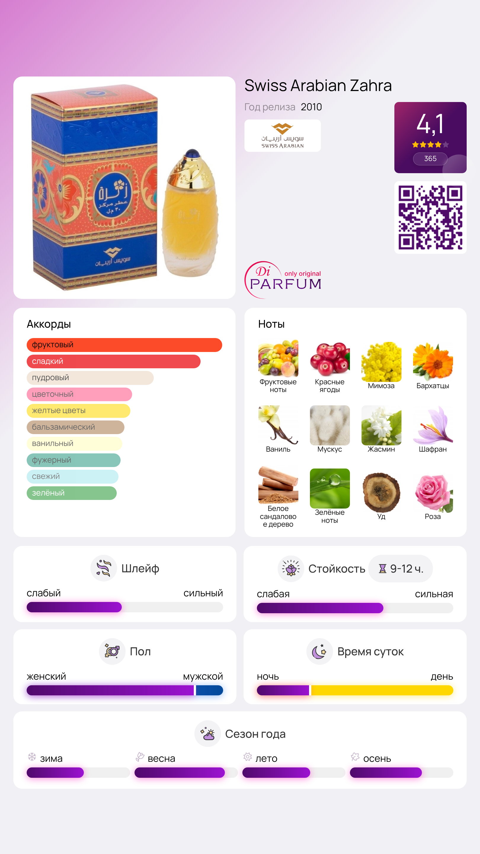 Swiss Arabian Zahra обладает уникальным подходом к парфюмерии, отходя от традиционных насыщенных ароматов в сторону утонченных и легких композиций, которые подчеркивают индивидуальность своего обладателя. Этот изысканный аромат отражает концепцию комфорта и естественной привлекательности.