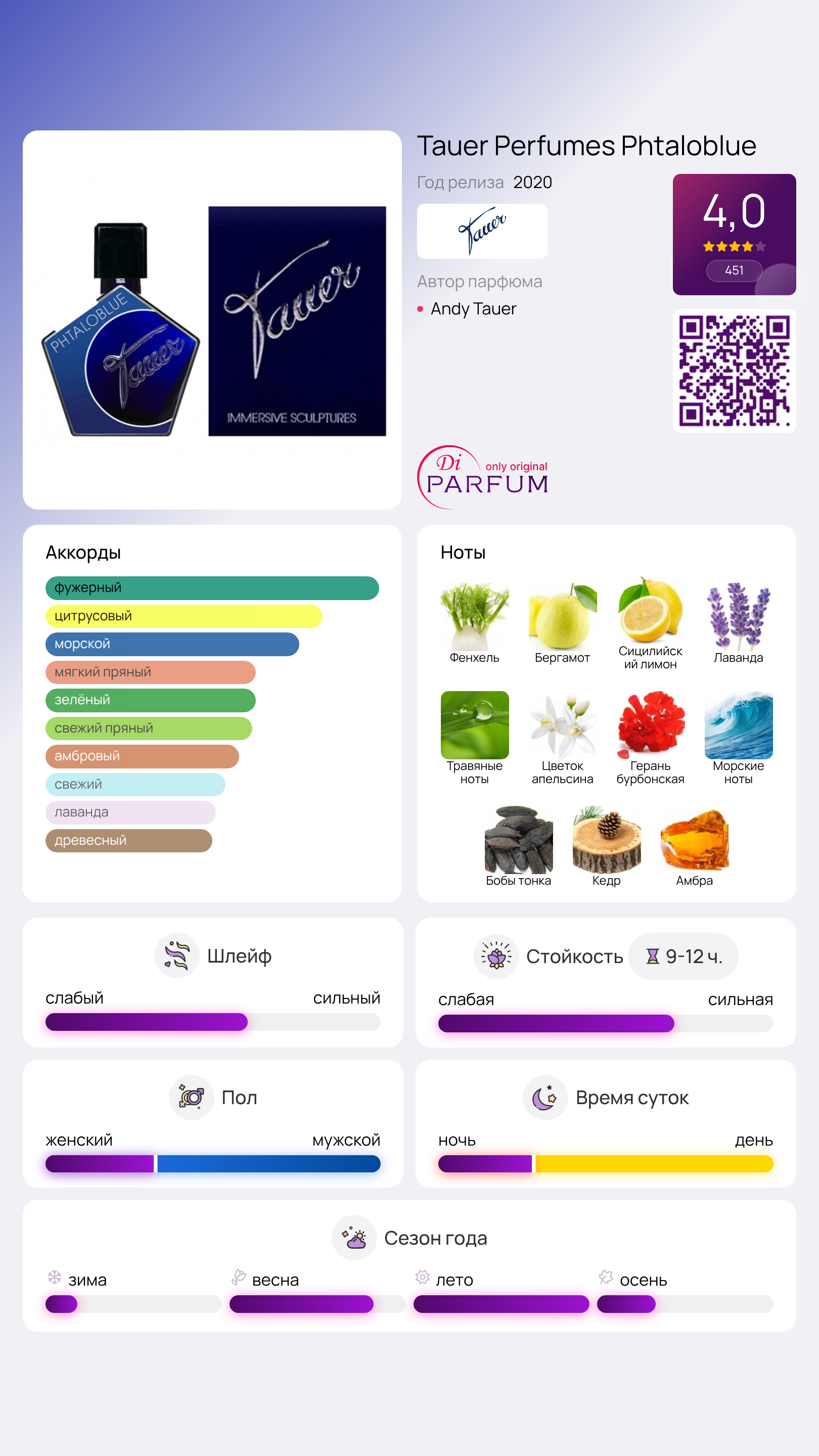 Шлейф парфюма обволакивает янтарной амброй и благородным кедром. Phtaloblue от Tauer Perfumes – это яркий пример креативного ниши XXI века. Данная парфюмерная вода была выпущена известным швейцарским брендом в 2020 году как еще одно достижение многогранного парфюмера, который также является художником и блогером.
