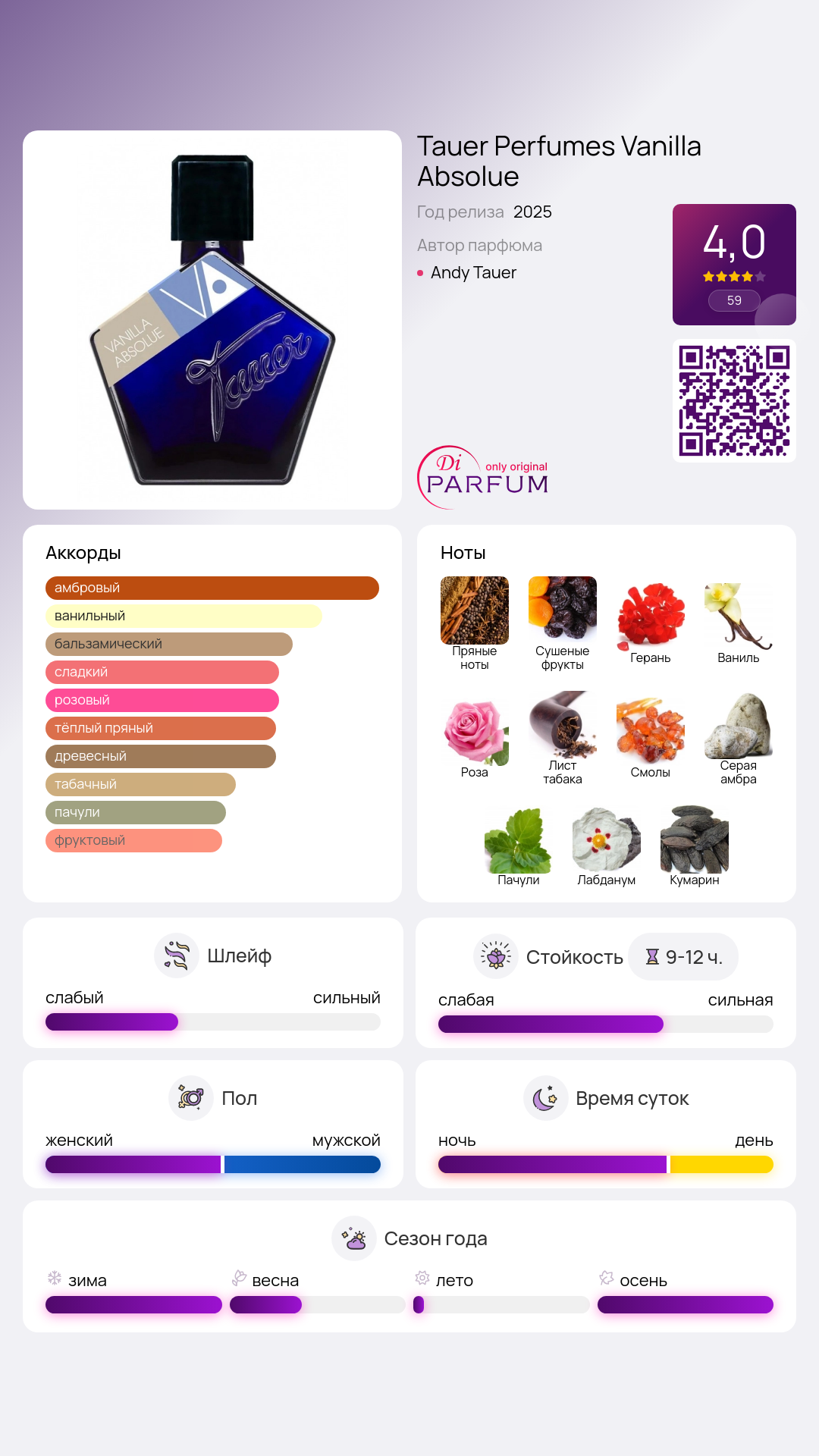Этот парфюм подойдет как для повседневного использования, так и для особых случаев, создавая атмосферу теплоты и уюта в любое время года. Откройте для себя мир наслаждения с Vanilla Absolue от Tauer Perfumes.