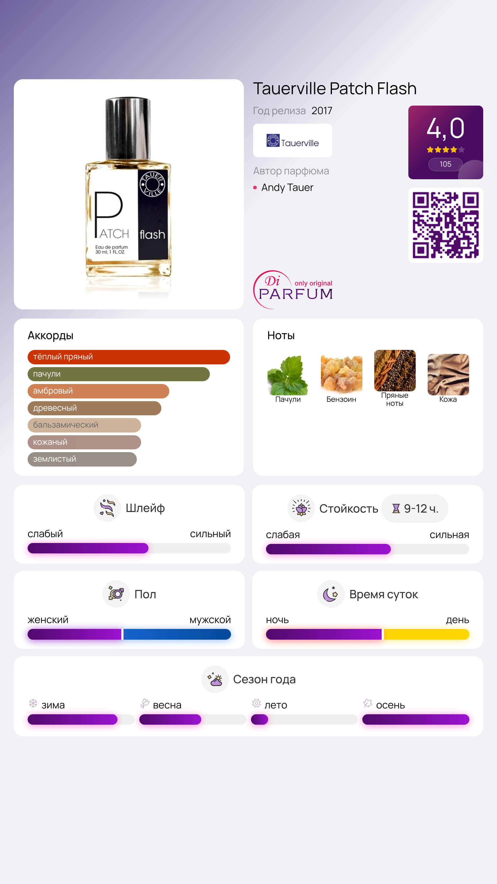 Богатый аккорд пряностей уводит в сказочный восточный мир, где эмоции захватывают, а чувства преобладают над логикой. К специям добавляется насыщенный аромат кожи, который наполняет композицию глубиной. Наконец, листья пачули начинают свою сольную партию, заполняя окружающее пространство землянистыми и сладковатыми бальзамическими нотами. Завершает этот коктейль загадочная бензоиновая основа Tauerville Patch Flash, придавая аромату волнующие смоляные оттенки.