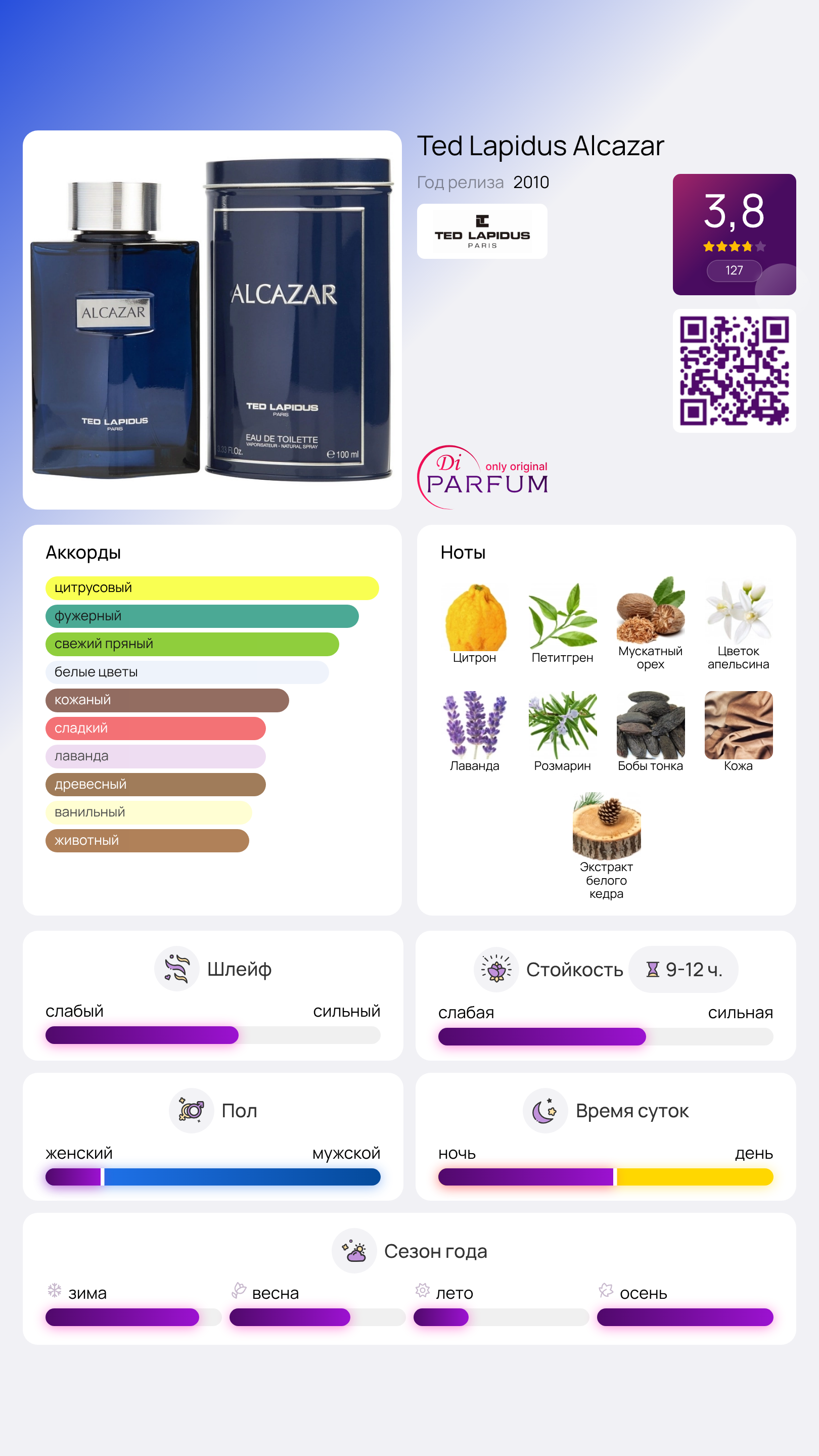 Отдельной частью наследия Ted Lapidus является его парфюмерная линия. Исключительные ароматы, среди которых выделяется Alcazar, завоевали признание во всем мире. Восточный фужерный состав открывается нотами цитрона, мускатного ореха и петитгрейна, в сердце звучат лаванда, розмарин и цветы апельсина. В его базе преобладает кожа, которая дополнена нюансами бобов тонка и белого кедра.