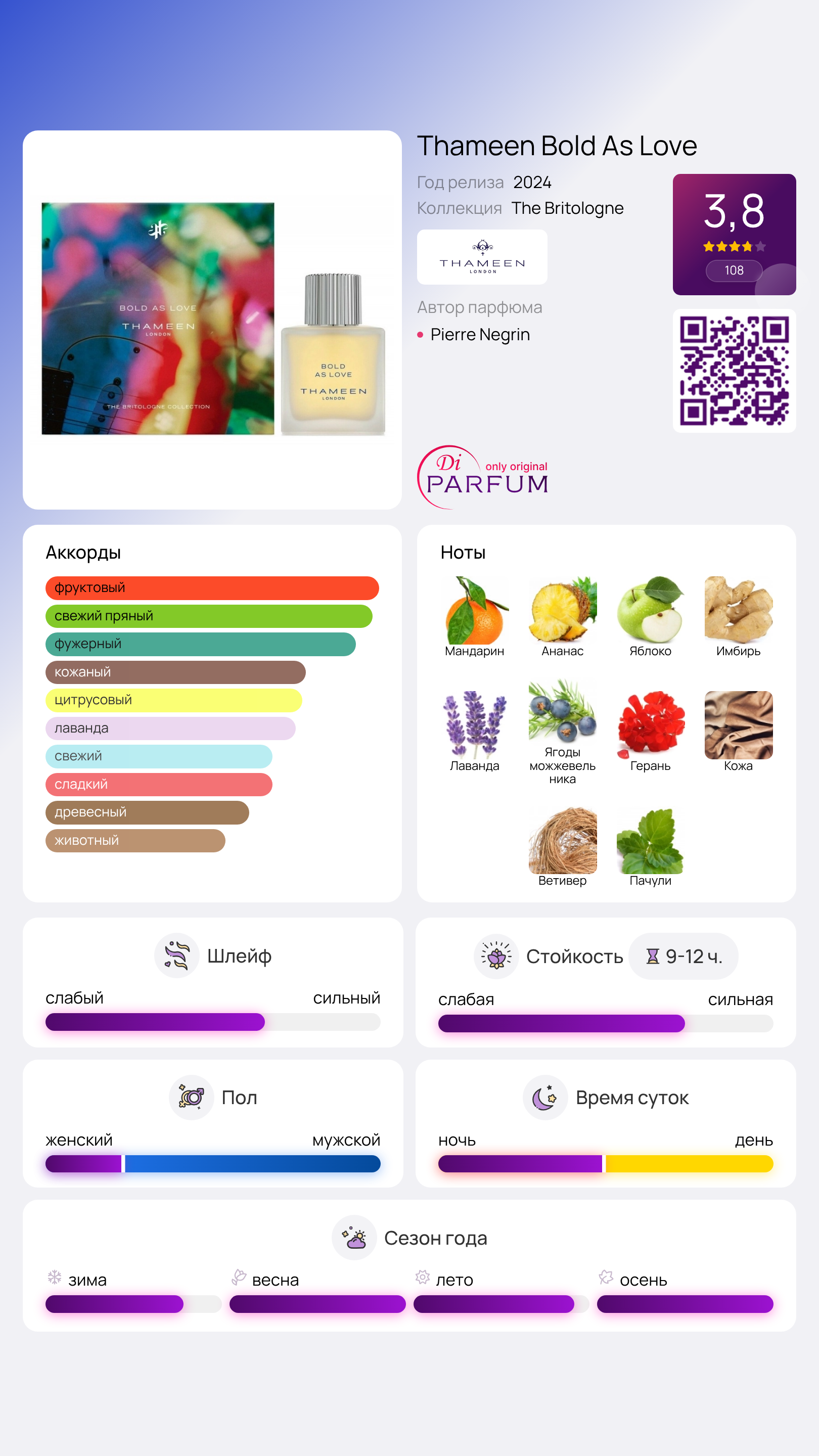 Bold As Love от Thameen — это уникальный аромат, созданный как для женщин, так и для мужчин. Выпущенный в 2024 году, этот парфюм стал новым ярким дополнением к коллекции бренда Thameen. За созданием аромата стоит талантливый парфюмер Pierre Negrin, которому удалось гармонично объединить разнообразные нотки.